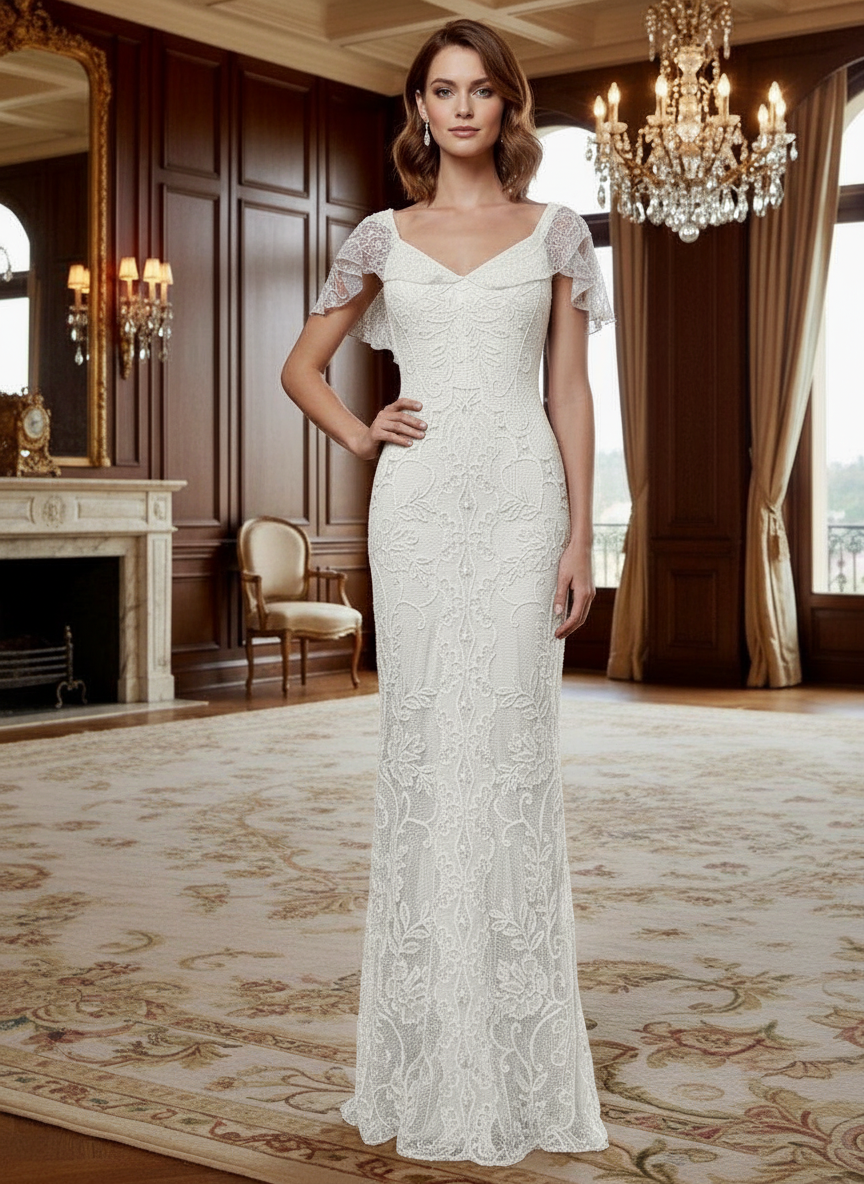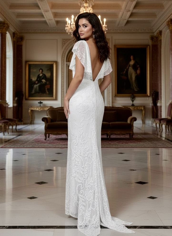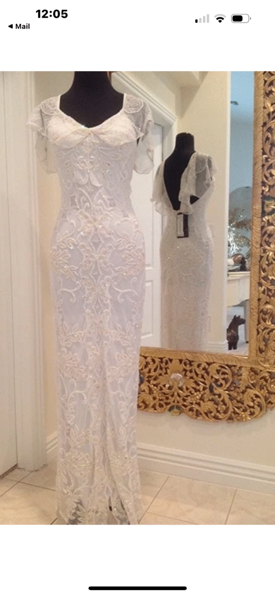 Beautiful, long, white lace hand beaded gown. Made on a power mesh fabric for an easy fit. It has a double train that is not that long. Great for a destination, wedding!