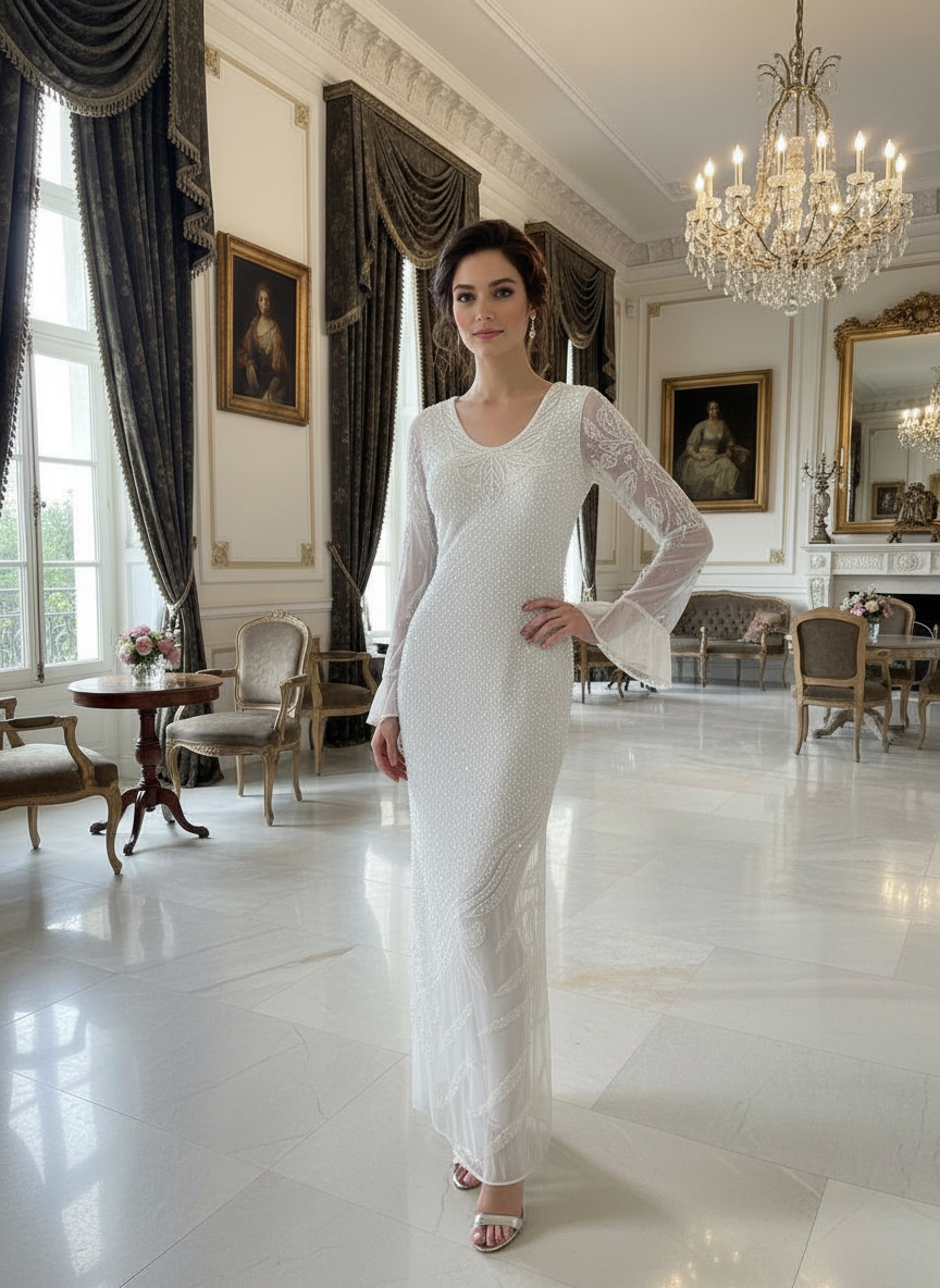 Beautiful hand beaded long dress with bell sleeves. Made on Power fabric for an easy fit.