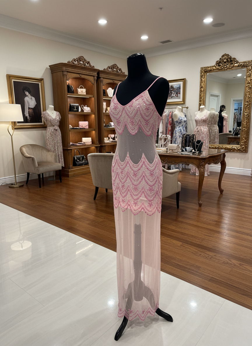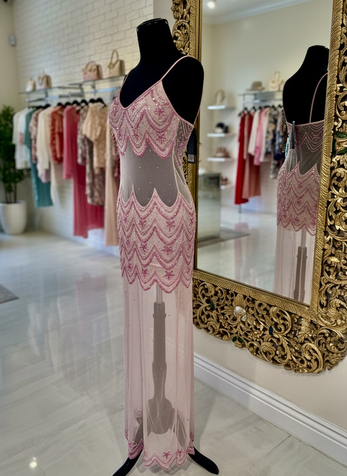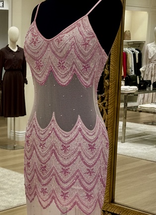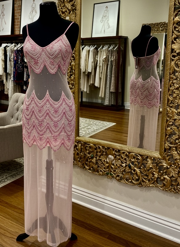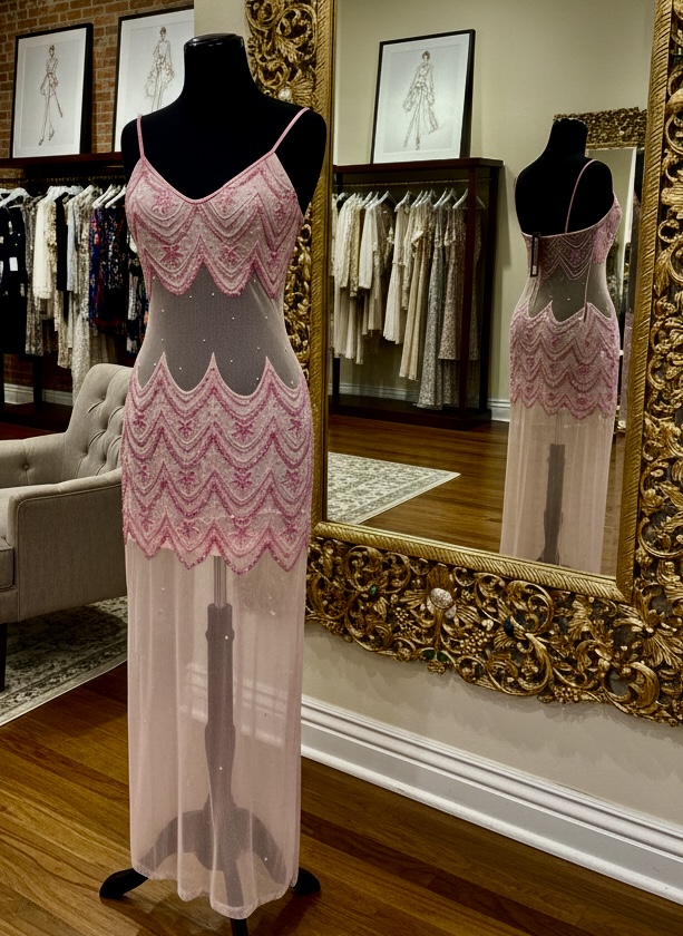 Beautiful, scallop design, baby pink dress with sheer midriff back and leg area. hand beaded on power mesh base. Size medium.