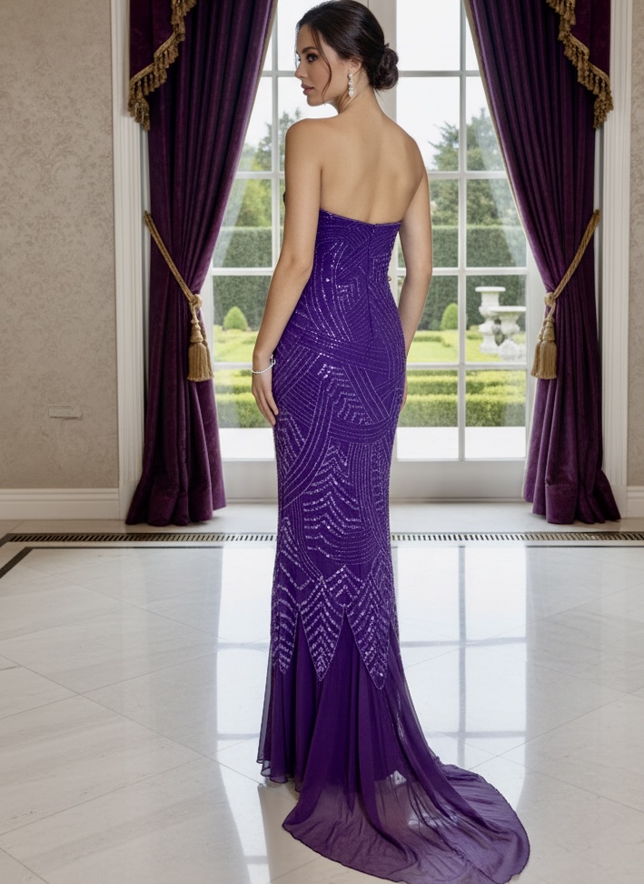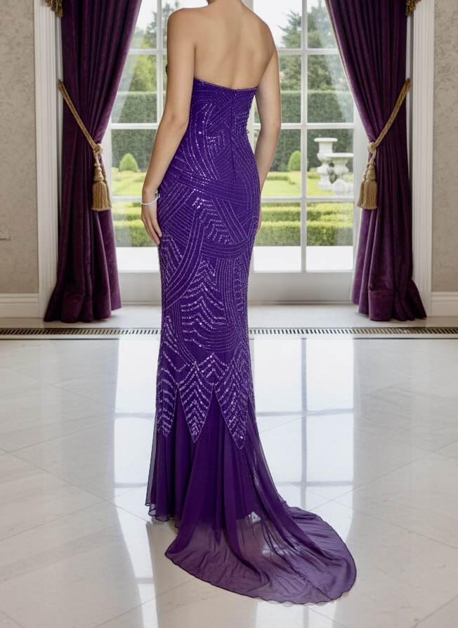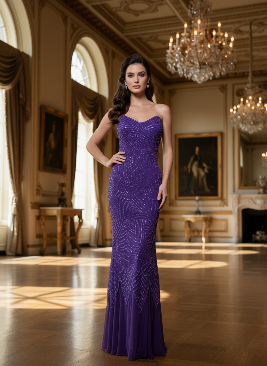 Beautiful long strapless dress hand beaded on power mesh fabric.  Stretch lining with a hand beaded stretch net overlay.  You will love this one.  Also has small straps if you do not want to wear it strapless.