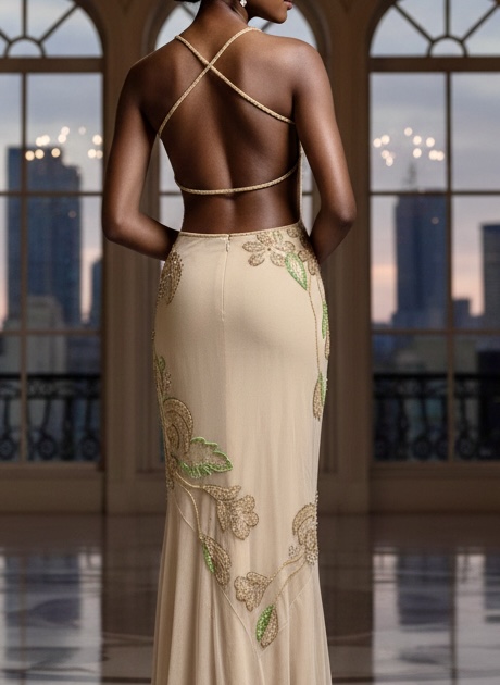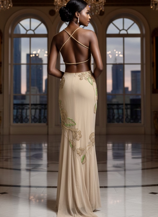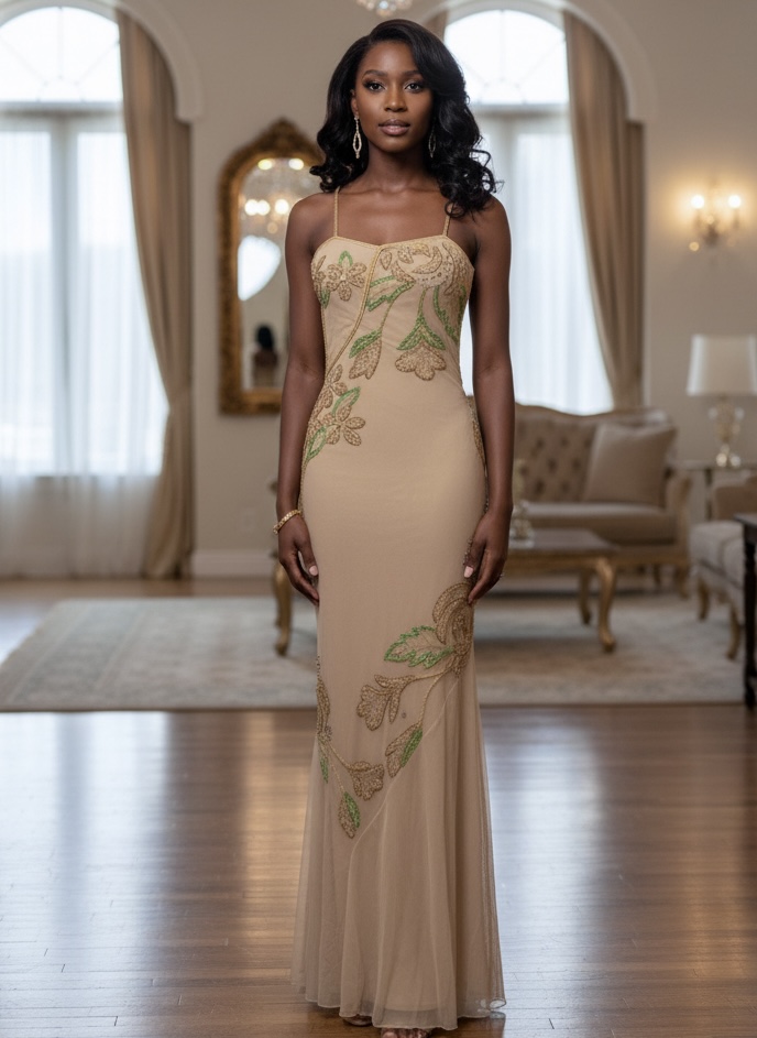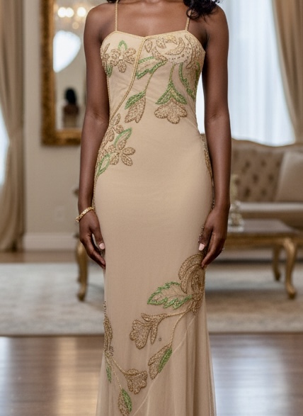 Beautiful evening gown with low back and floral and rhinestone embellishment. Made on Power mesh fabric for an easy fit. Size small