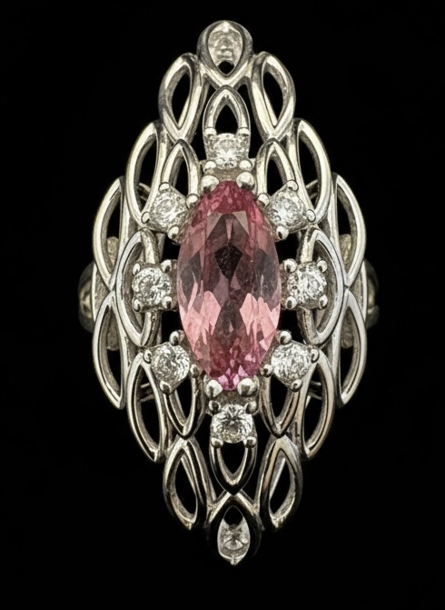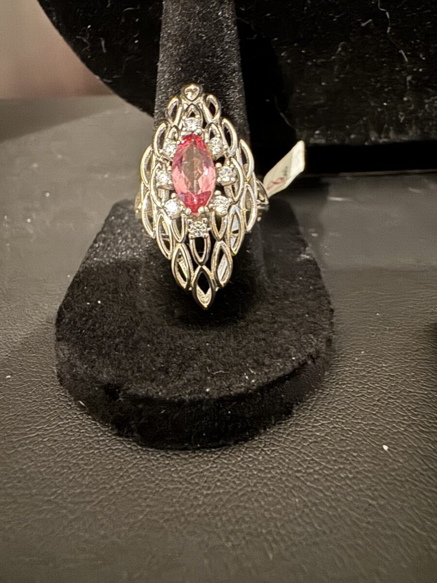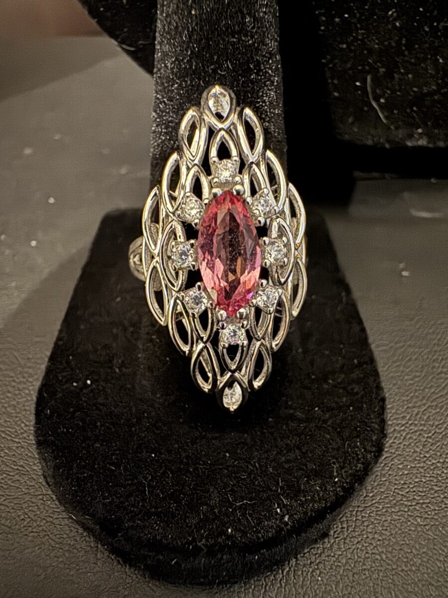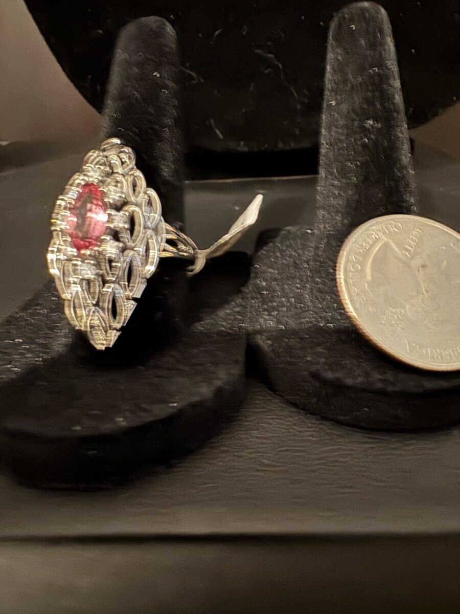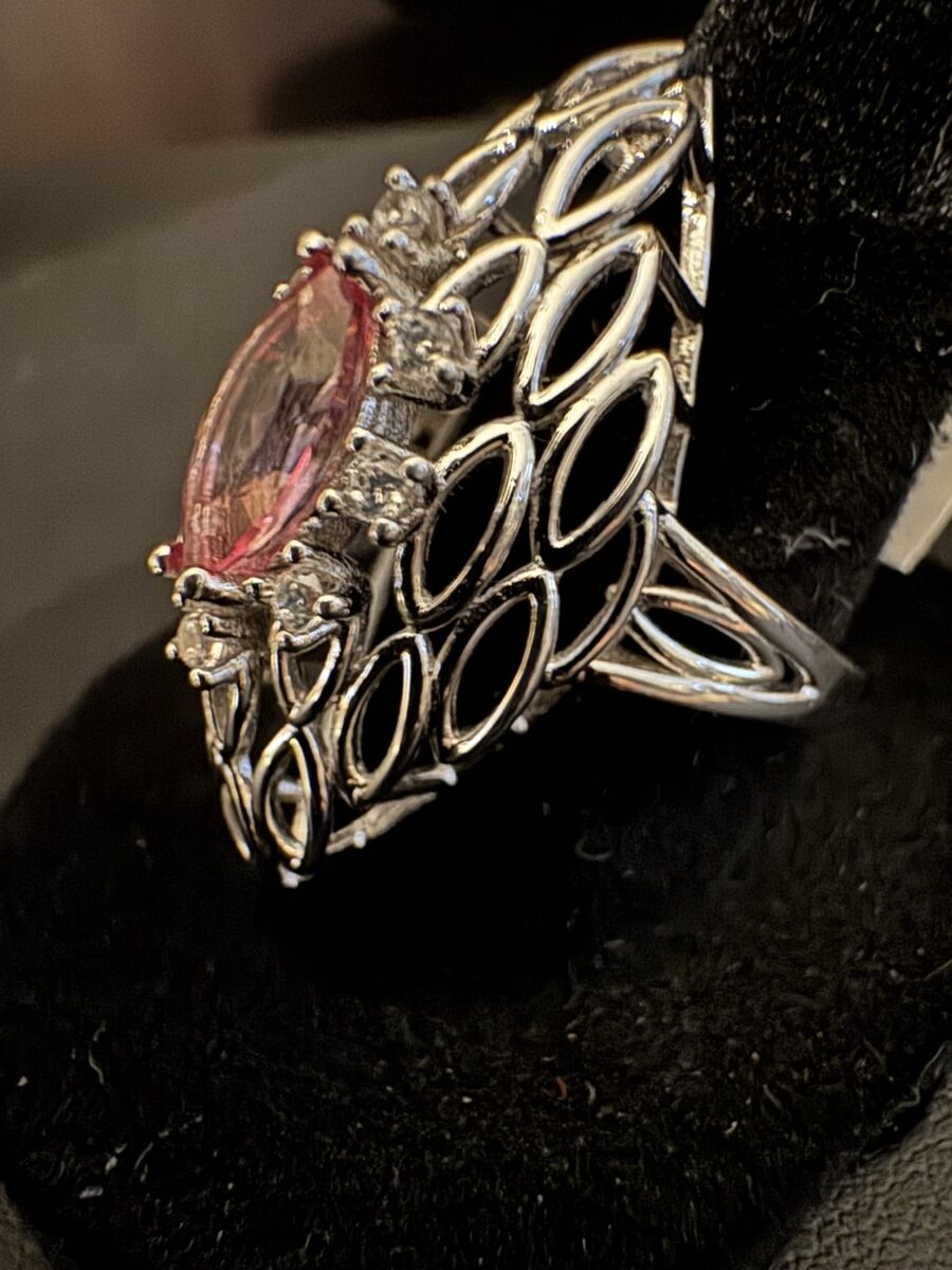 This is a beautiful marquise shaped topaz set in an intricate sterling silver setting. A very classy statement. Currently size 8 and can be sized by a jeweler.