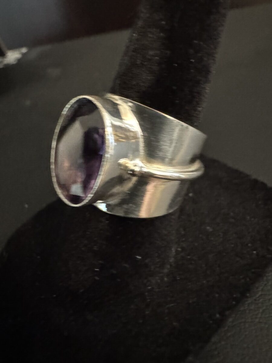 Sleek and modern sterling silver surround this oval amethyst stone. Size 6