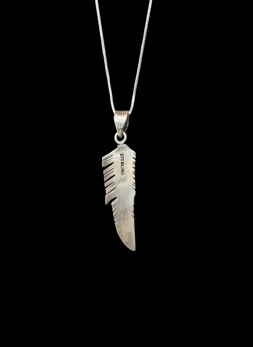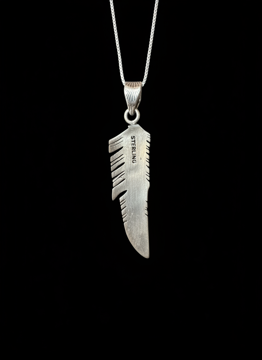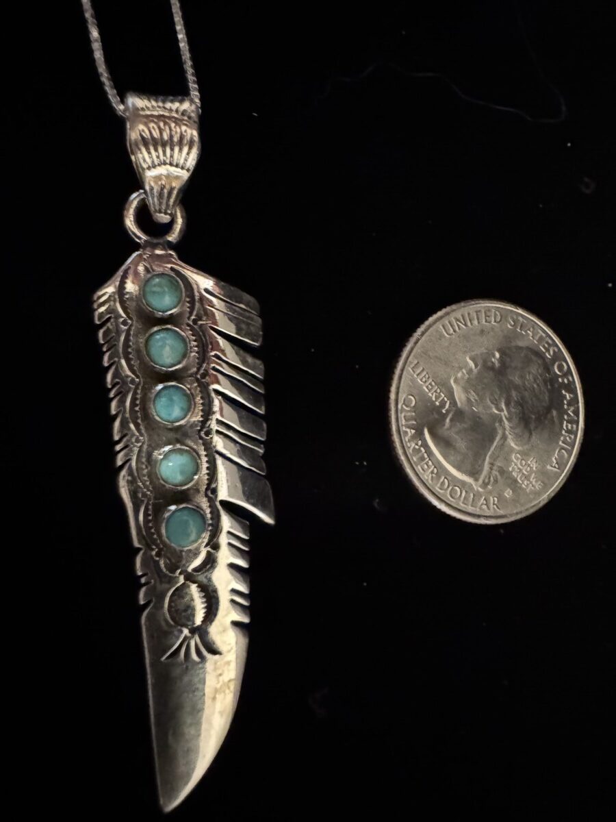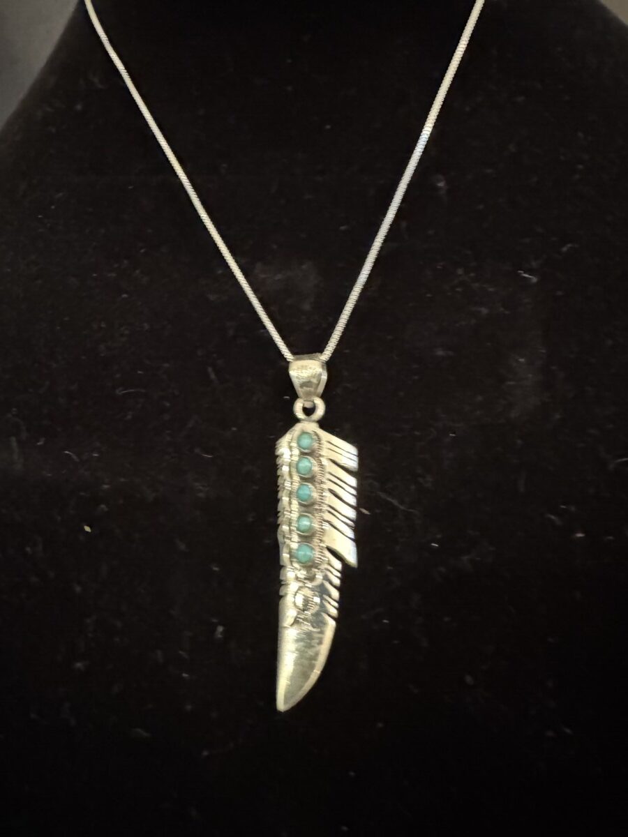 Stunning native design pendant in sterling silver feather design complete with genuine turquoise stones. 18 inch chain included.