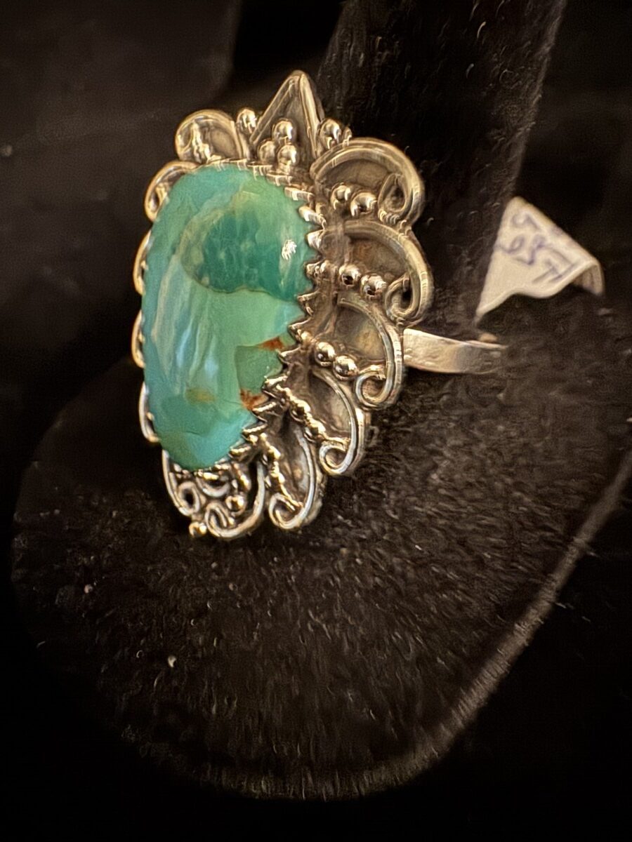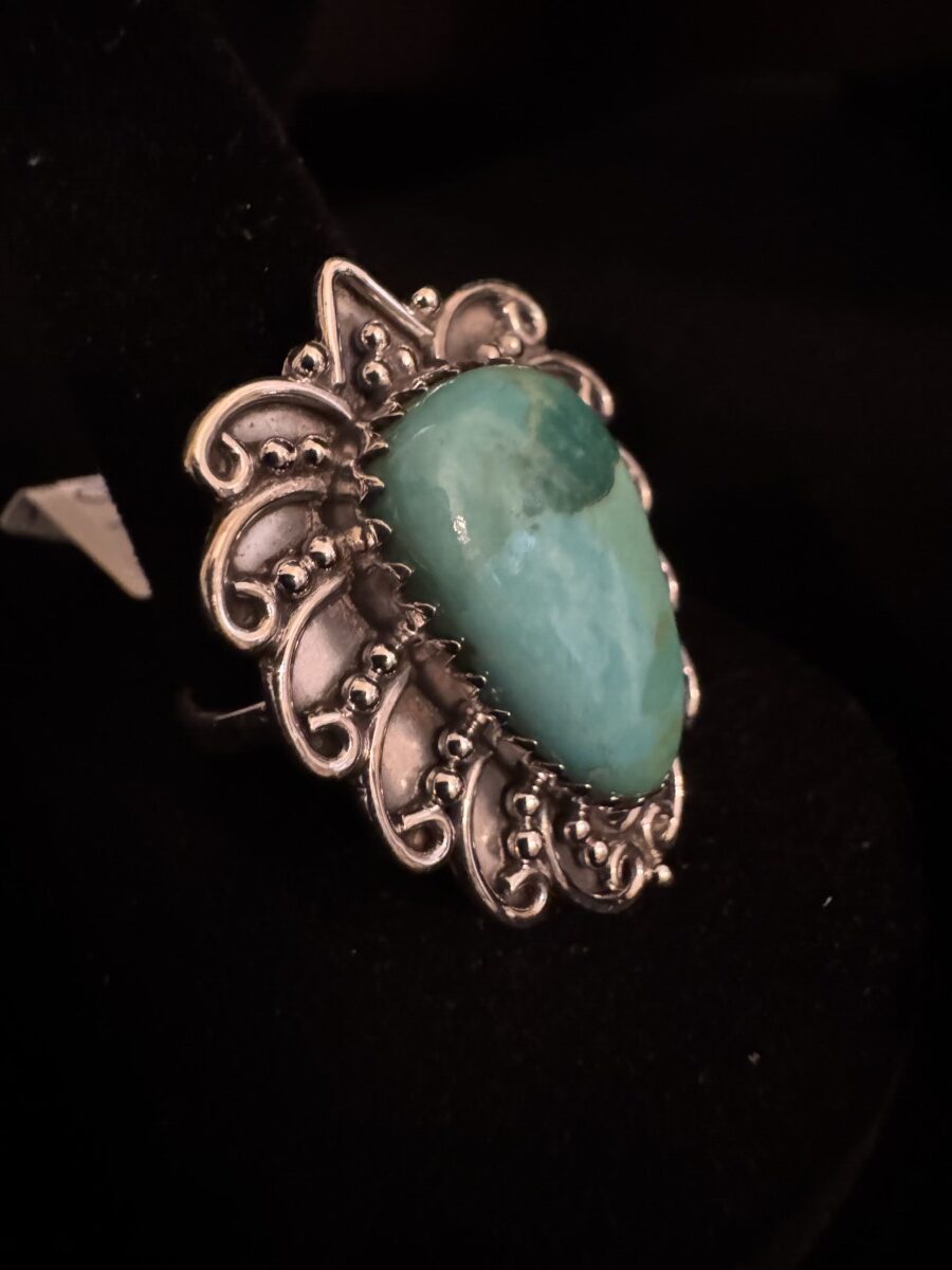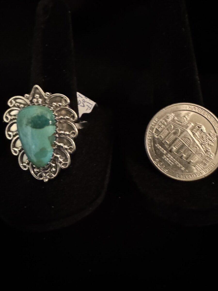This is a beautiful pair shaped turquoise set in an intricate sterling silver setting. You will love this! Adjustable size