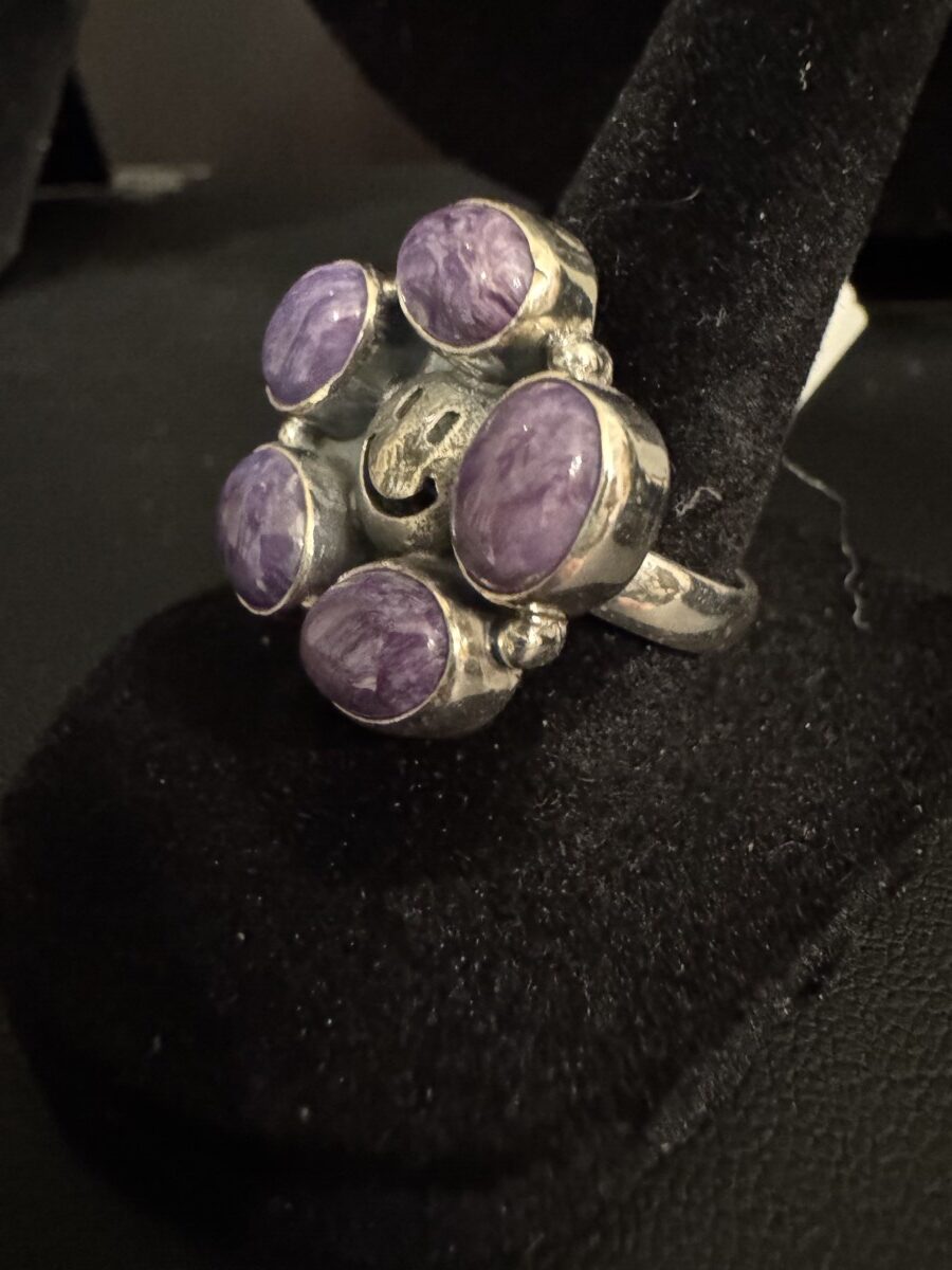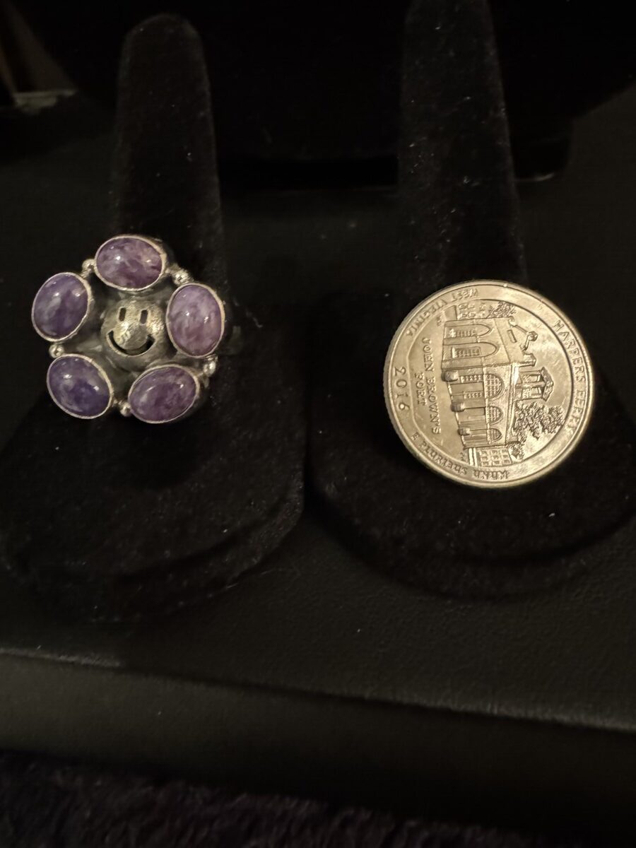 This is an adorable purple charolite stones set in Sterling silver with a smiley face center. Size 8. Very unusual ring you will love it.