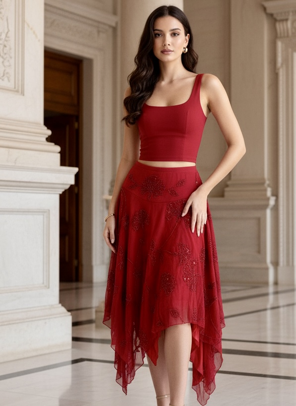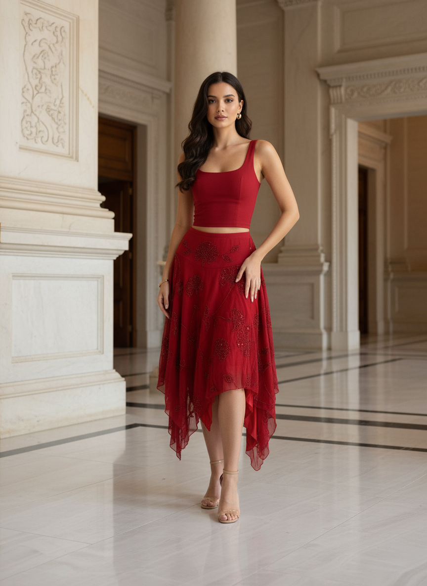 Beautiful red handkerchief skirt hand beaded with floral design. One only size large