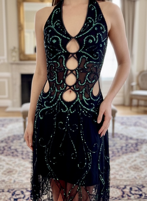 Stunning short dress on Power mesh fabric a little sexy a lot of classy. Hand beaded handkerchief hem great for any evening out! Size small