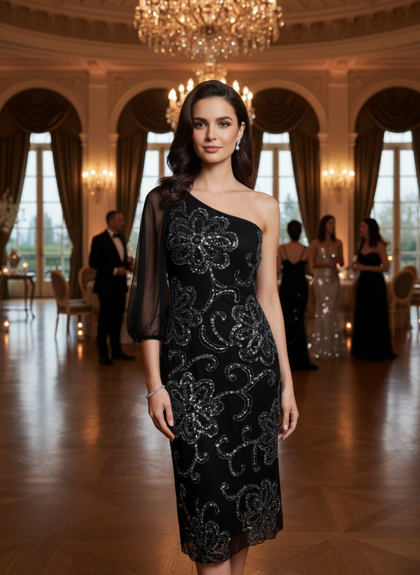 Beautiful hand beaded short dress. Elegant scarf on one shoulder. Very well made you will love this. Size small