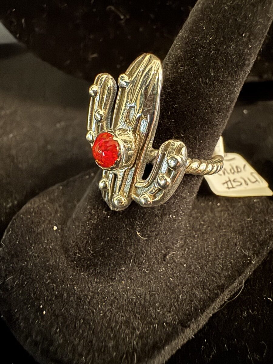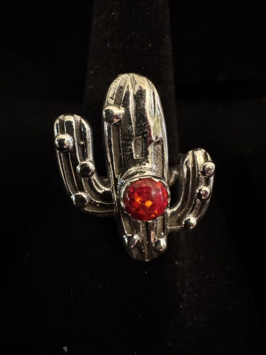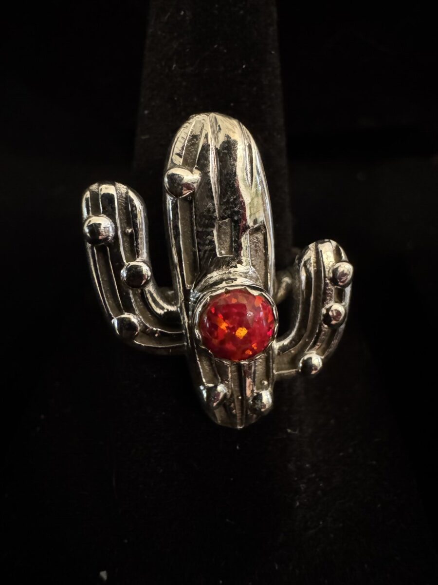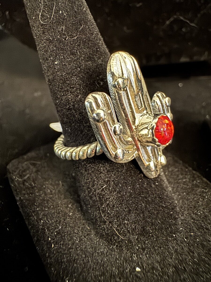 Unusual cactus ring set with a small fire opal. Sterling silver size 6, but can be adjusted a little at the bottom