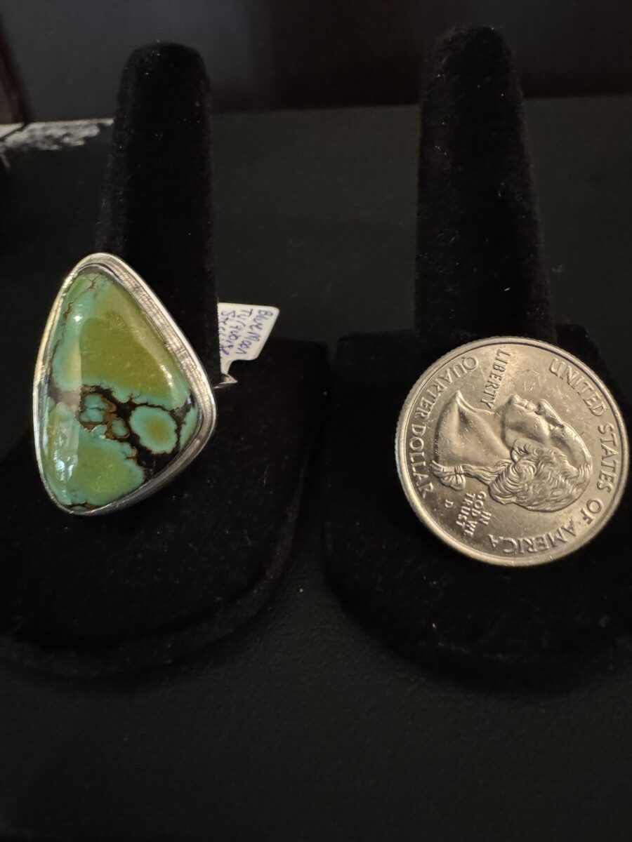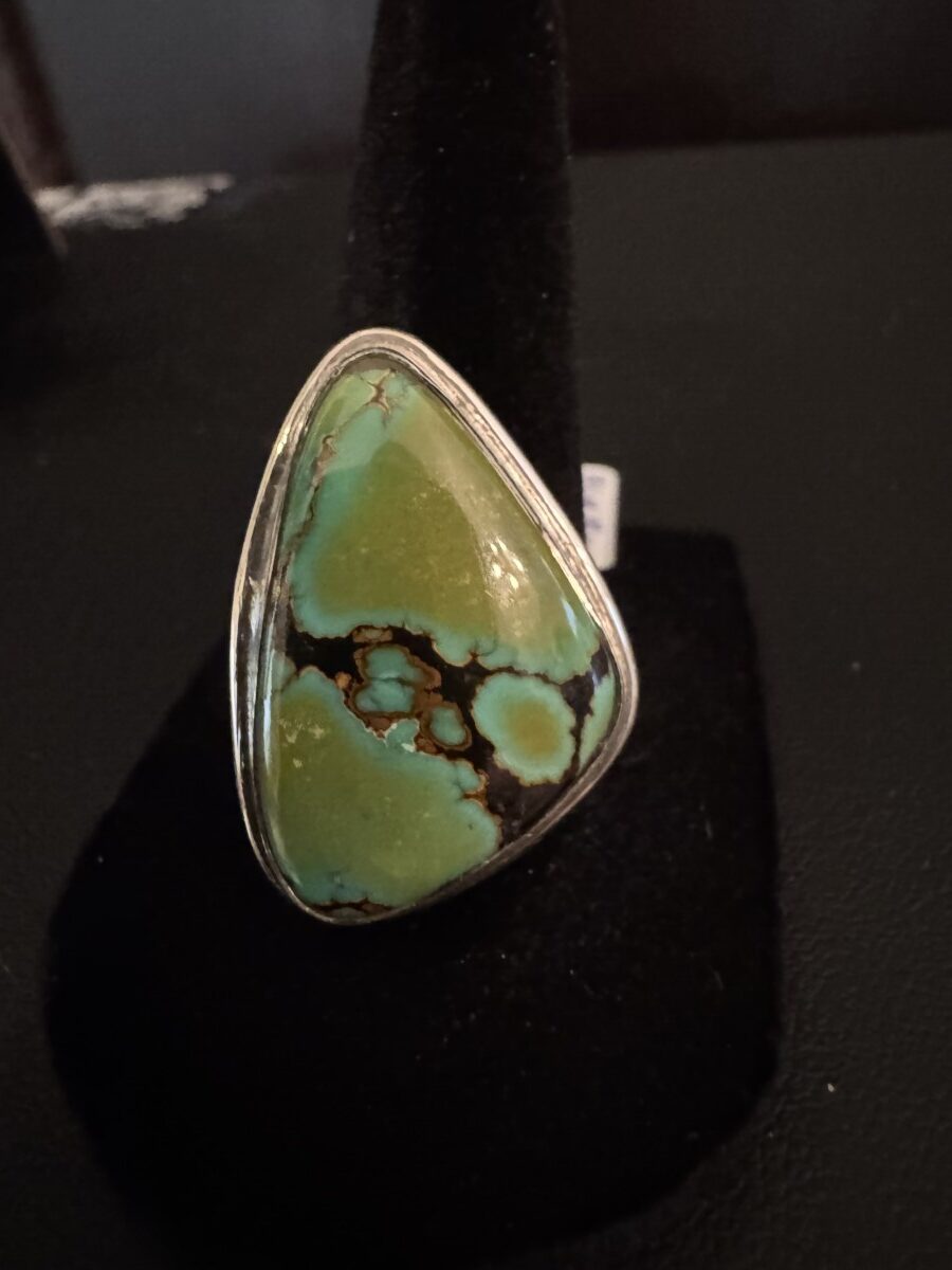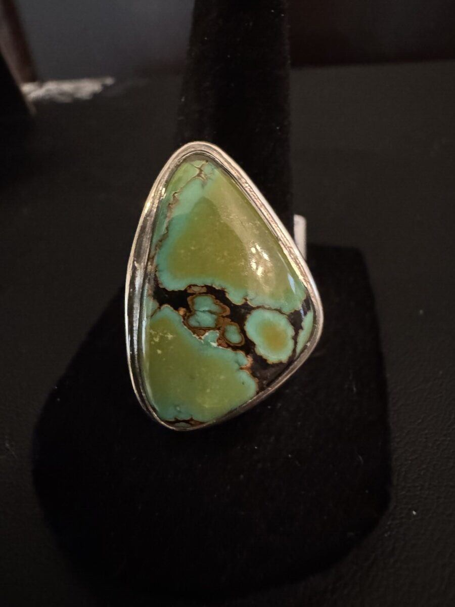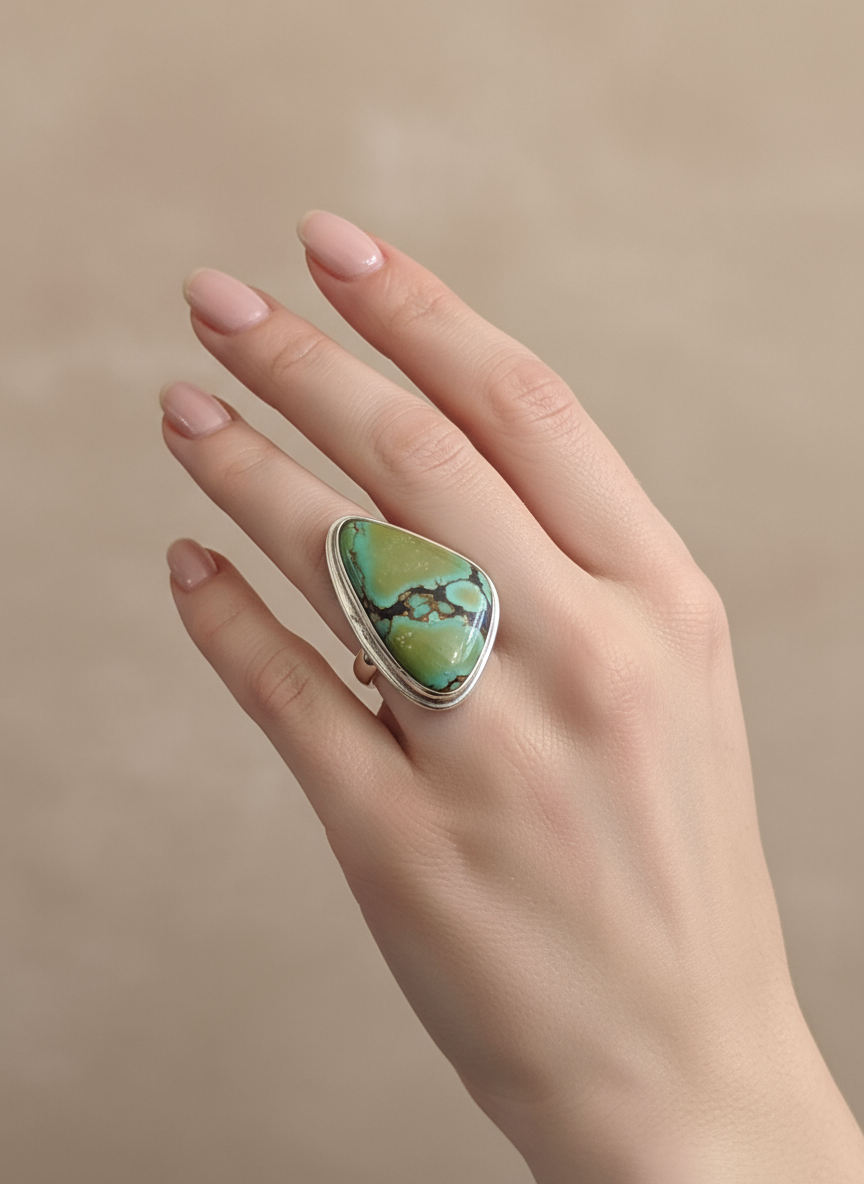 This beautiful ring is genuine. Turquoise in the greenish shade set in a stunning sterling silver triangular setting. Ring is adjustable
