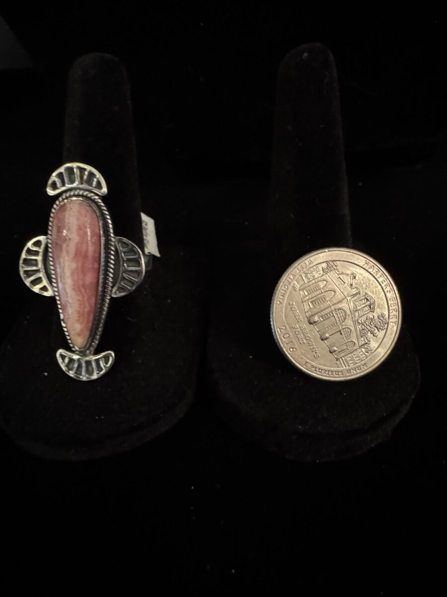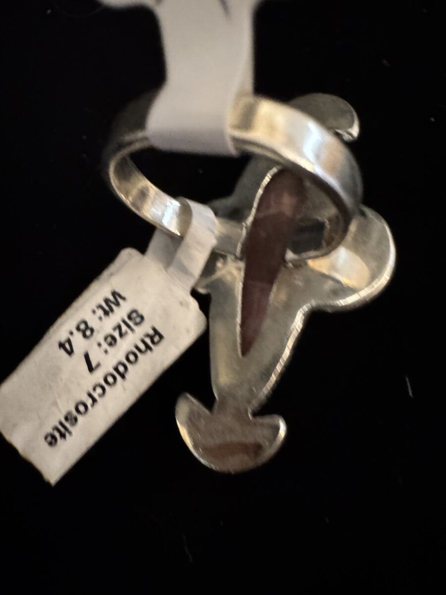Beautiful sterling silver and pink rhodocrosite Stone ring. Elegant and unusual. Your shirts get many compliments size 7 and can be served by a jeweler