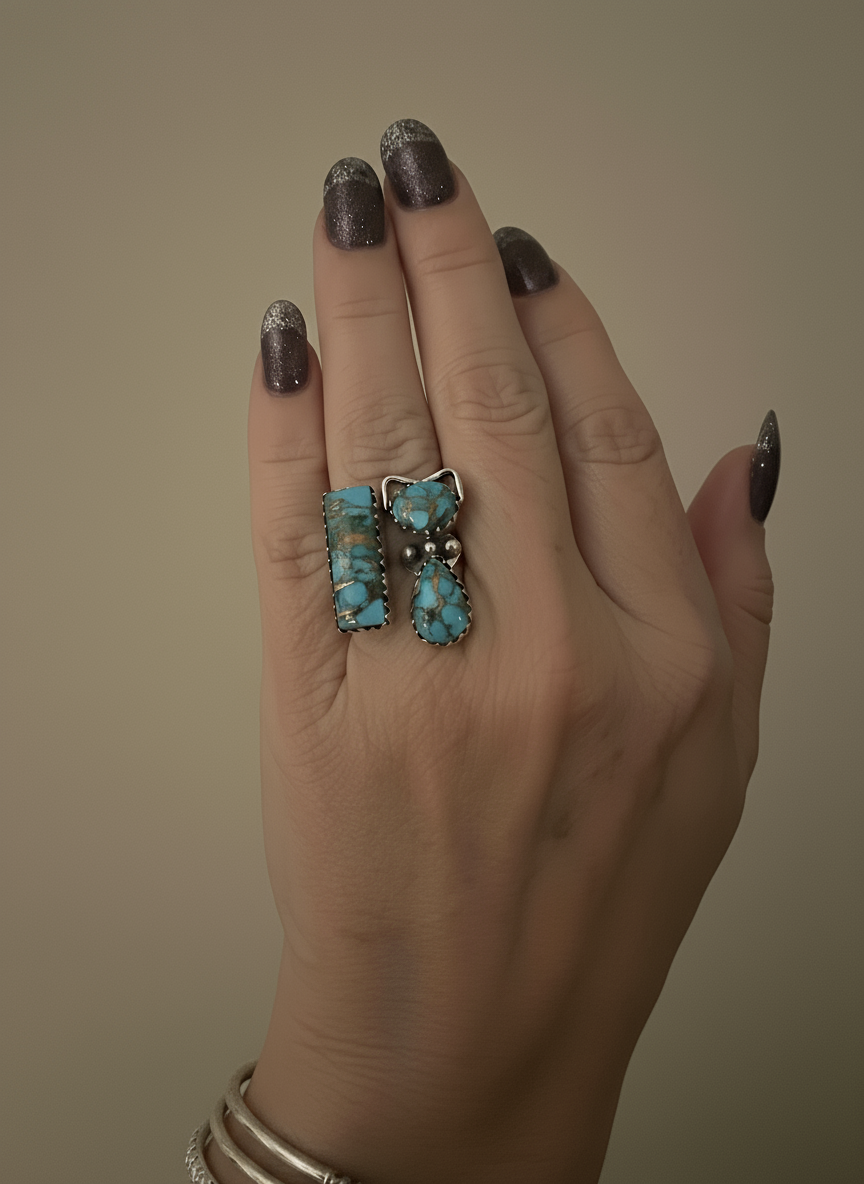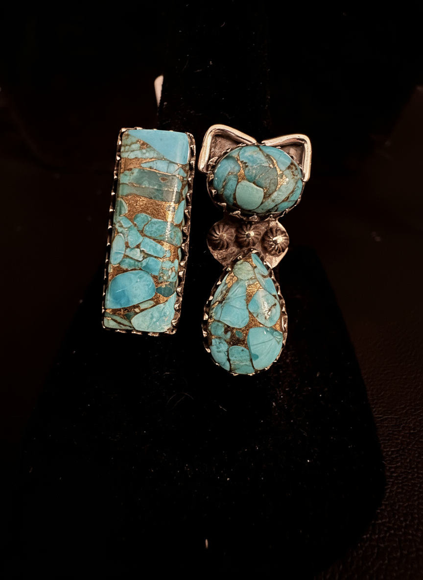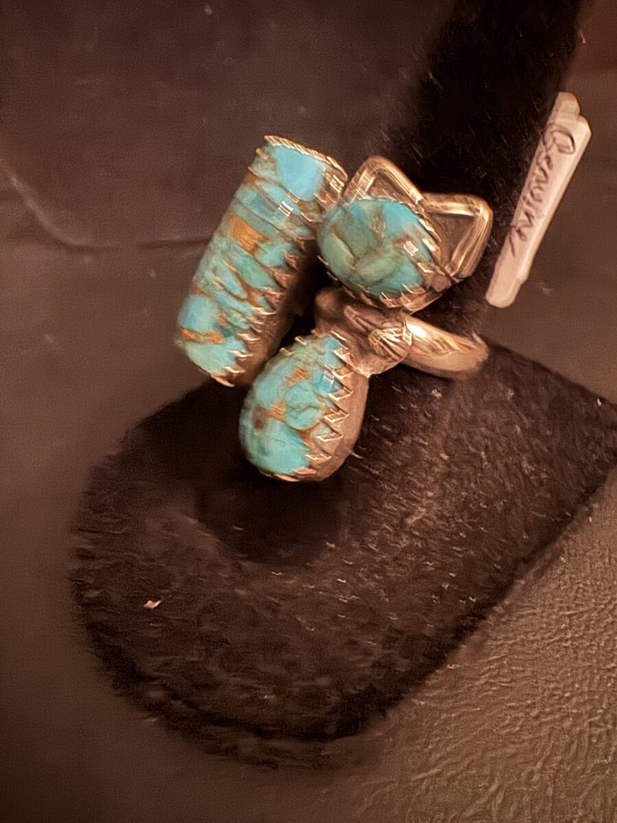 This is a beautiful ring that is very unusual. If featured a turquoise cat and a rectangular piece of turquoise set in a sleek sterling silver setting. You will get many compliments on this ring. Size 6 1/2 but can be sized up by a jeweler