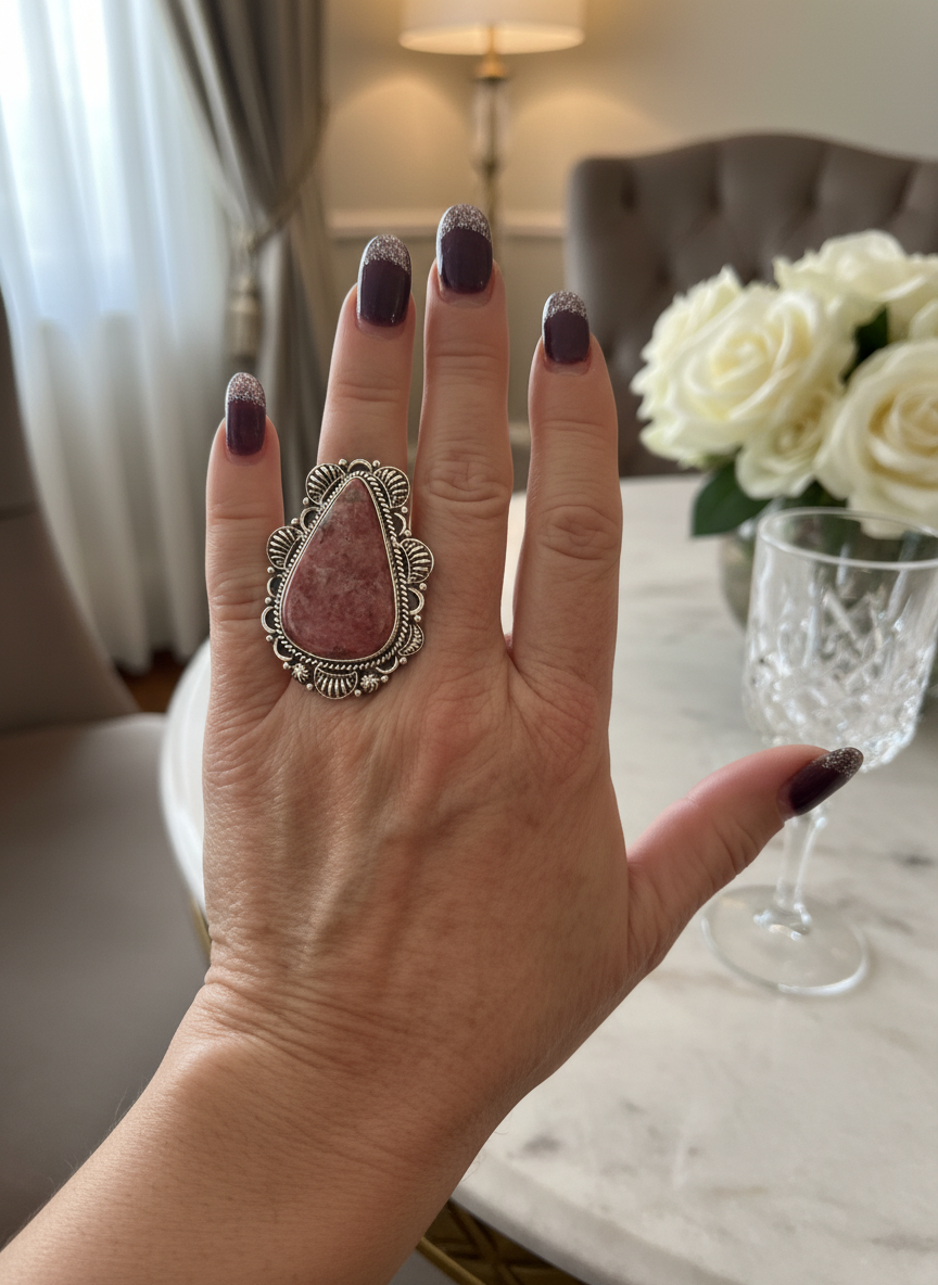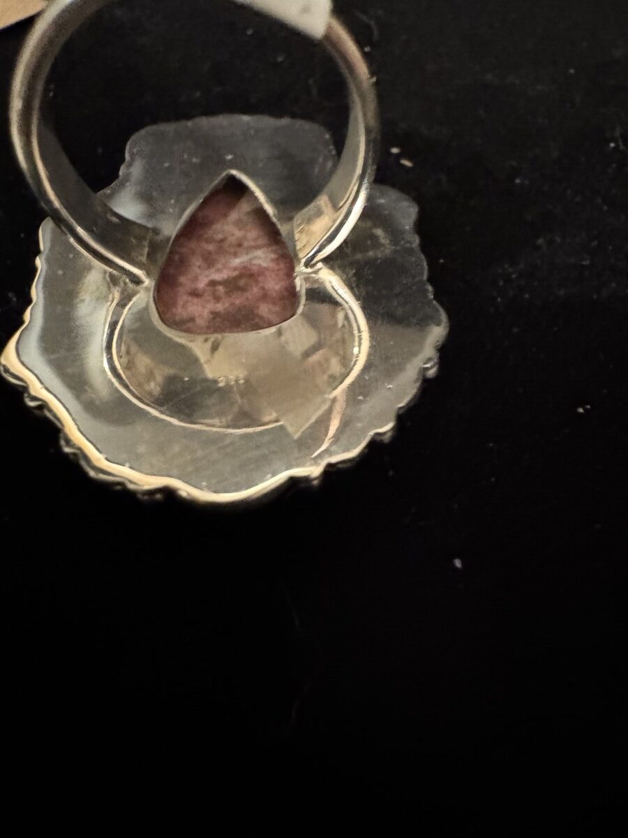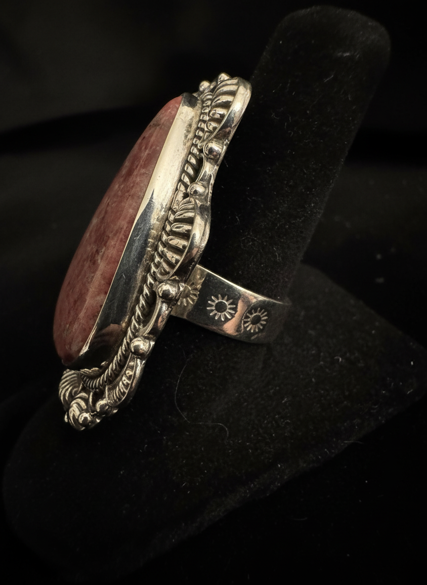 This is a stunning ring very heavy. The band is awesome engraved with suns. Made of sterling silver. Featuring a large pink, genuine zoisite stone. Truly, a statement piece that is one of a kind size 8