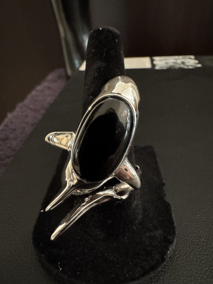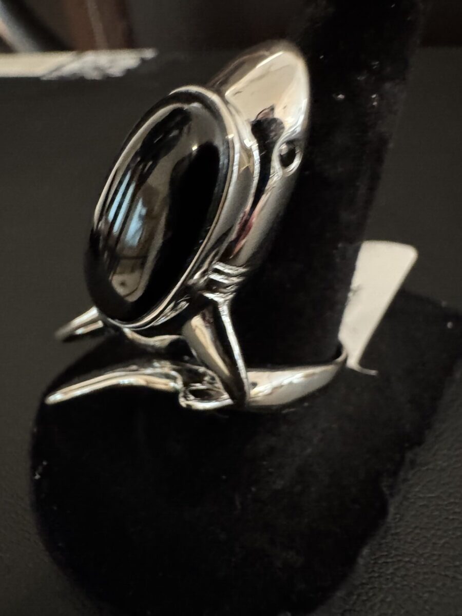 This is a very unusual sterling silver and black Onyxshark ring. Perfect gift for a fish enthusiast or an attorney. Very sleek and beautiful size 8 and can be resized by a jeweler