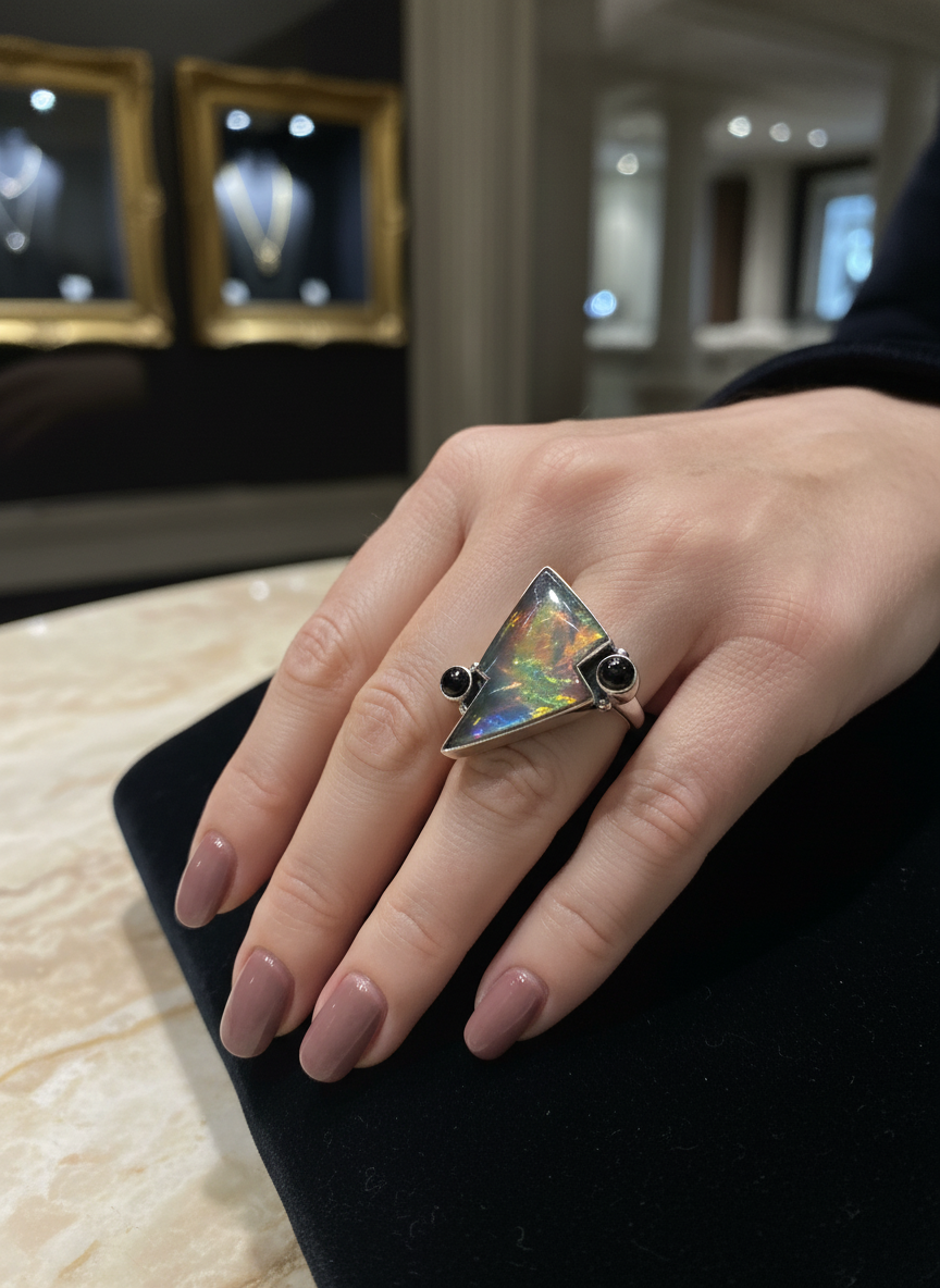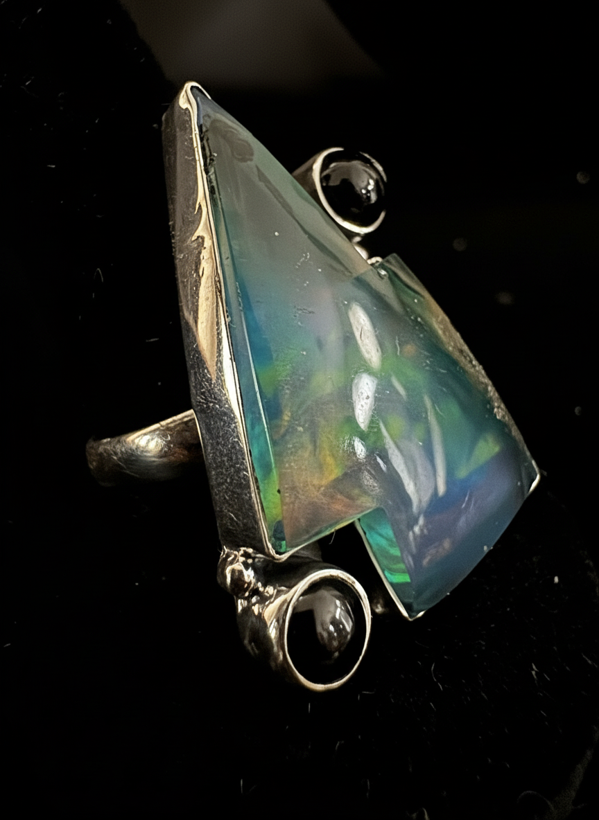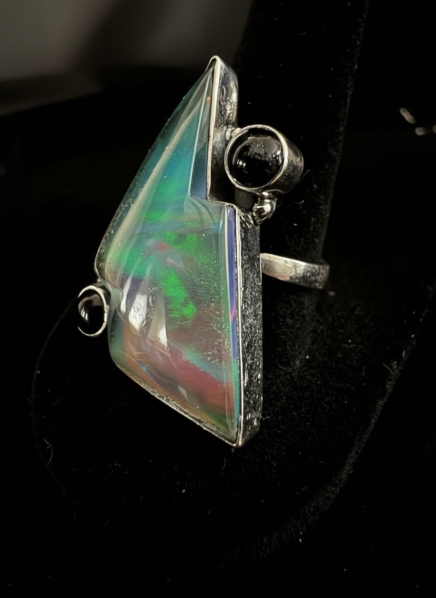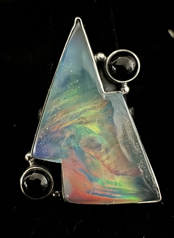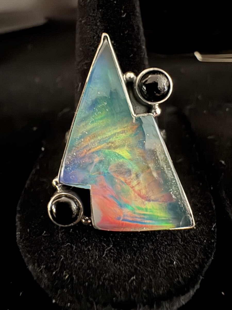 This is a stunning opal lightning bolt with round small black onyx accent set in a Sterling silver setting. Very unusual and definitely a statement piece. You will love it. Adjustable size