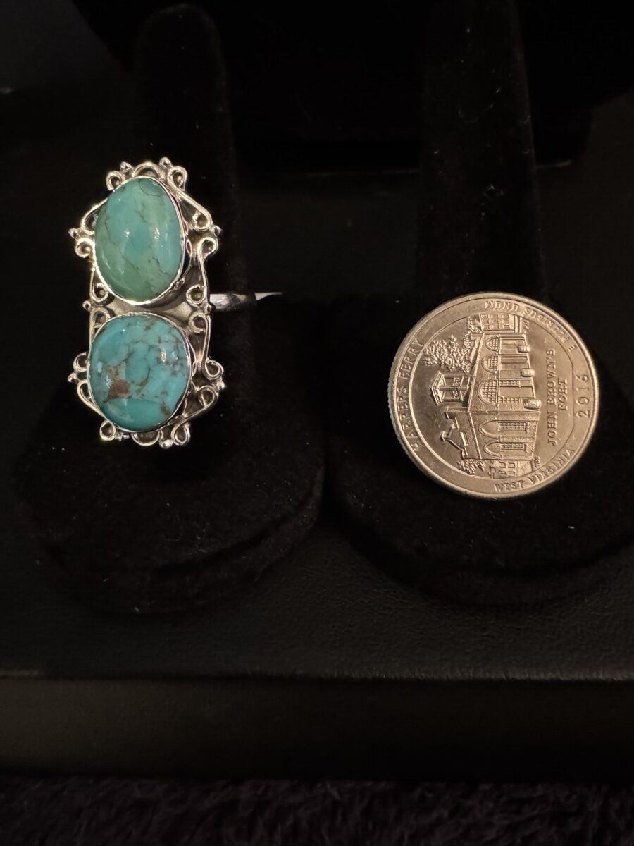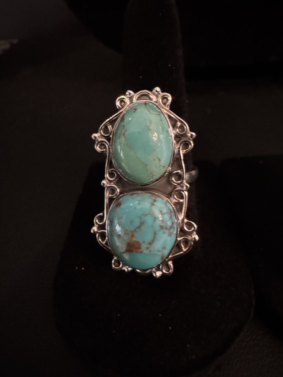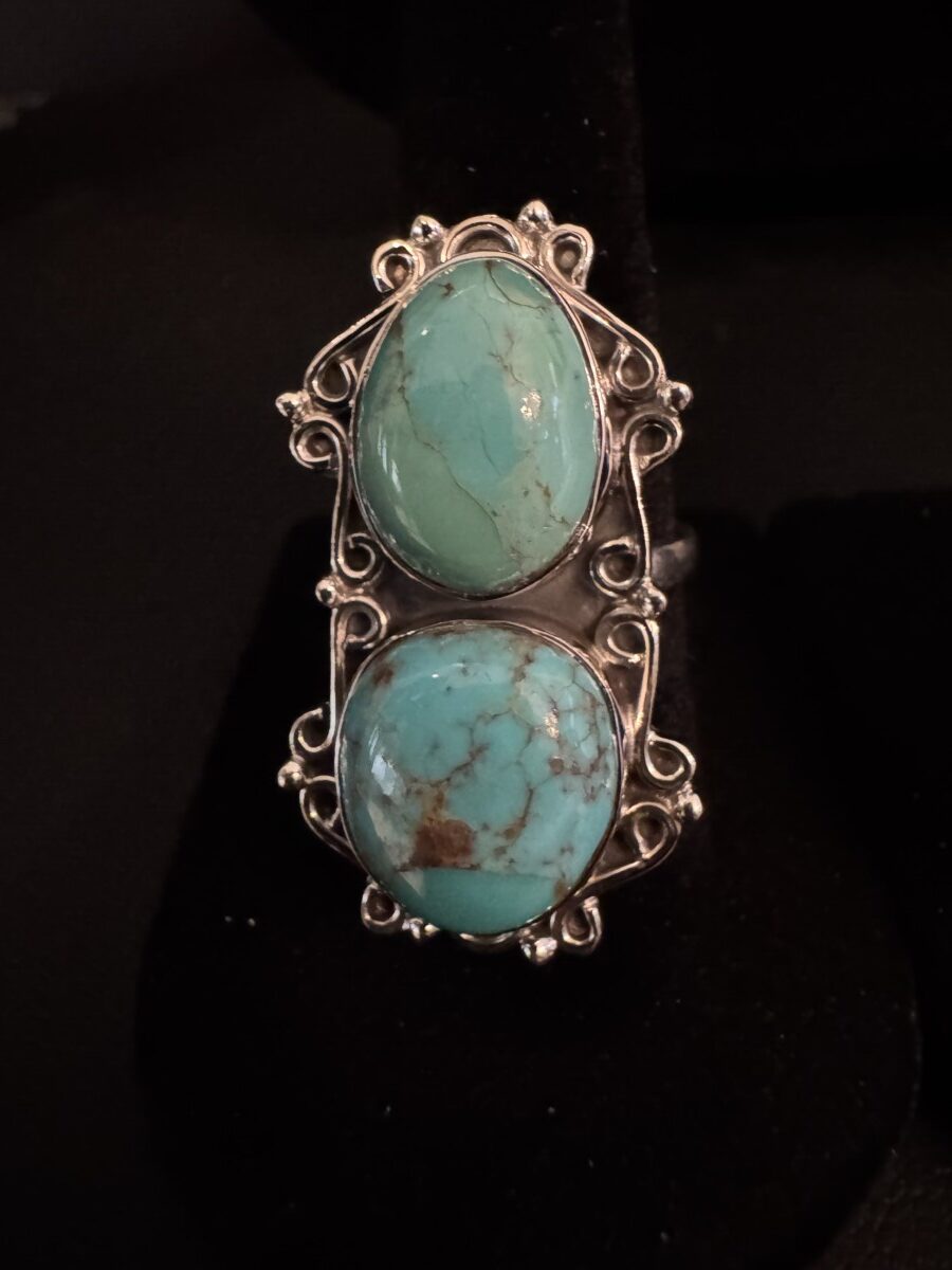 This is a stunning, large double turquoise set in an intricate sterling silver setting. You will love the beauty of this peace and treasure for years to come. Adjustable size