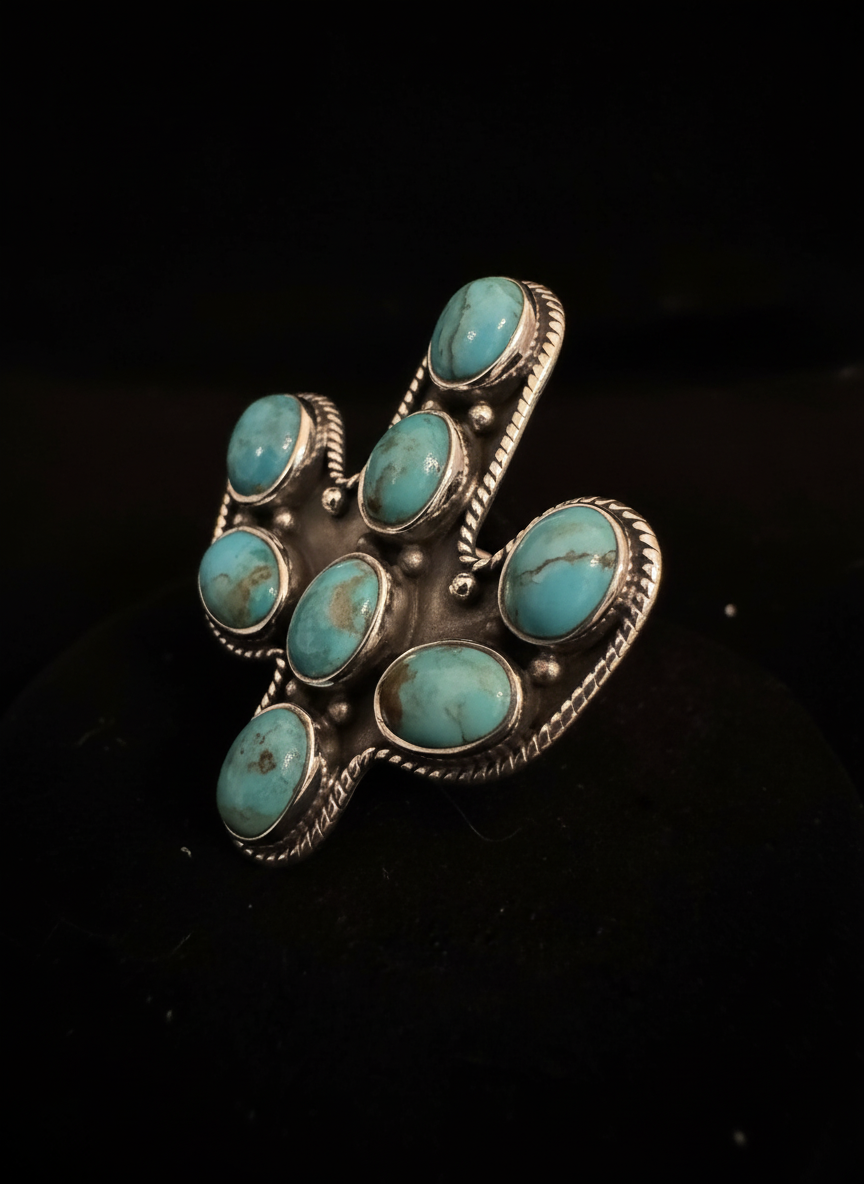 Unique cactus ring set in a sterling silver setting with genuine turquoise stones. Size 7 and can be sized by a jeweler