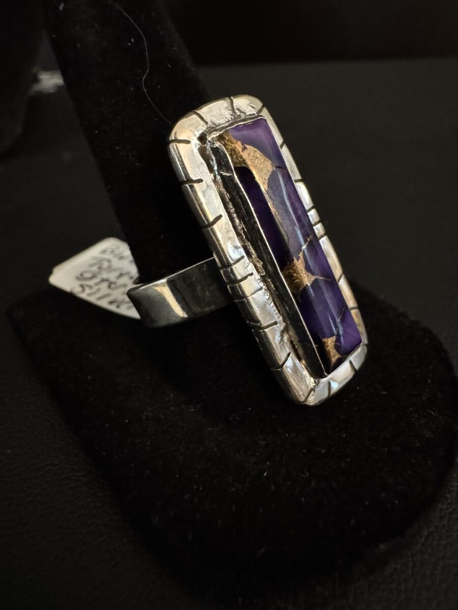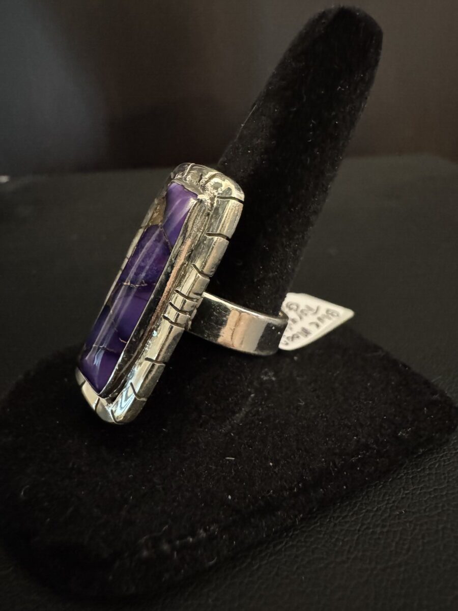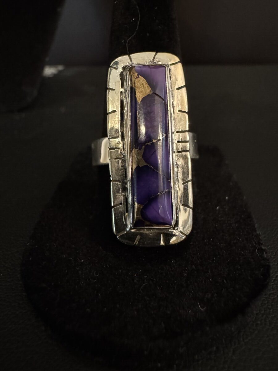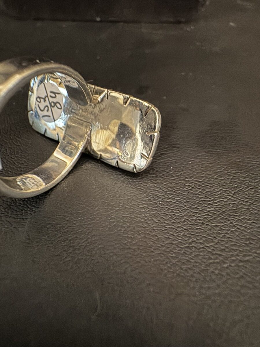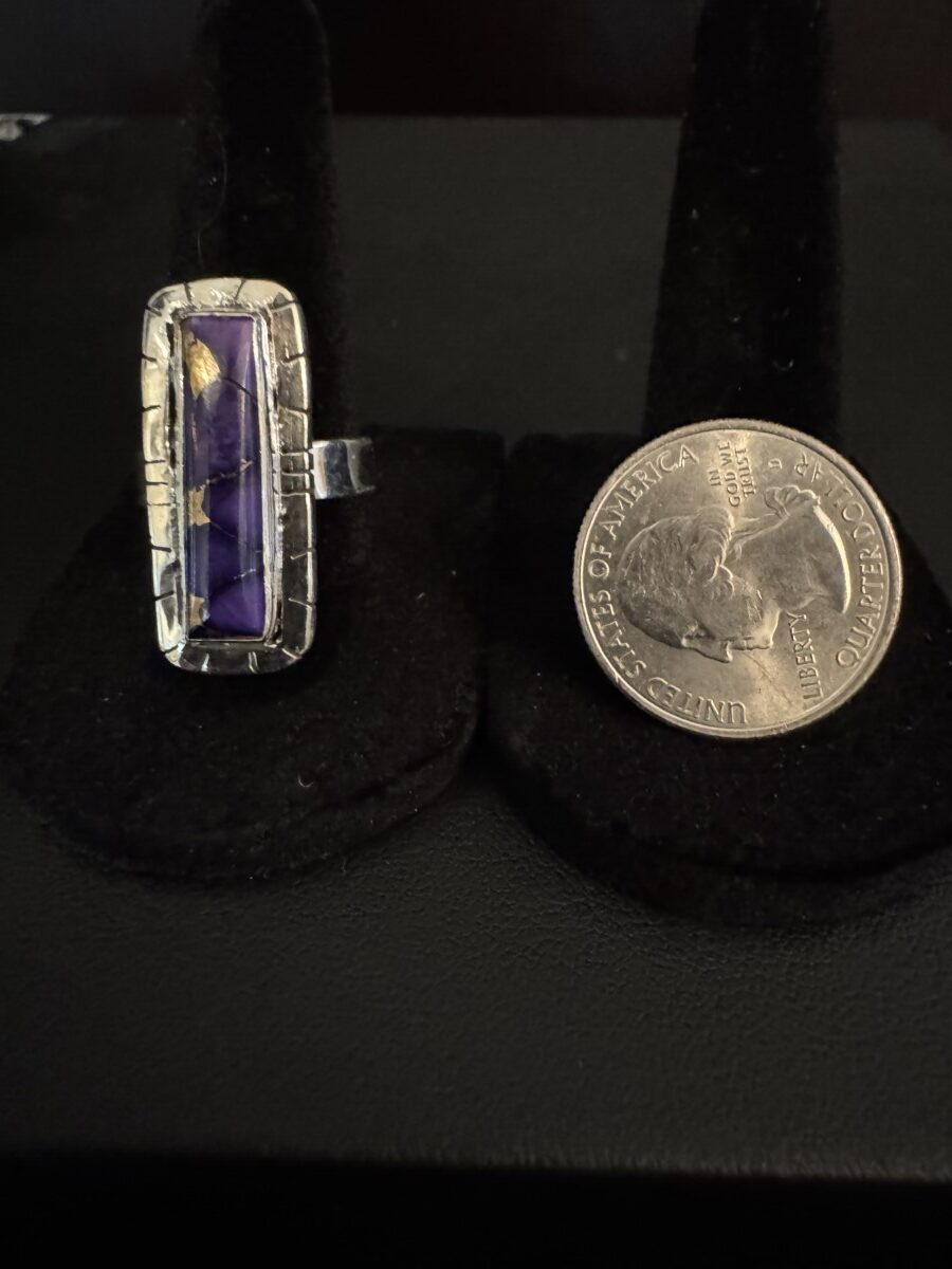 Unusual rectangular blue moon turquoise set in a gorgeous sterling silver setting. Closed back. Size 7 1/2 and can be sized by a jeweler.