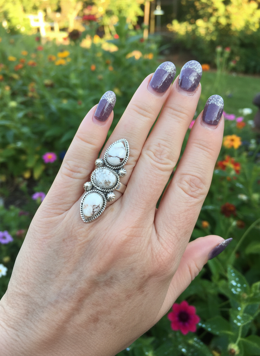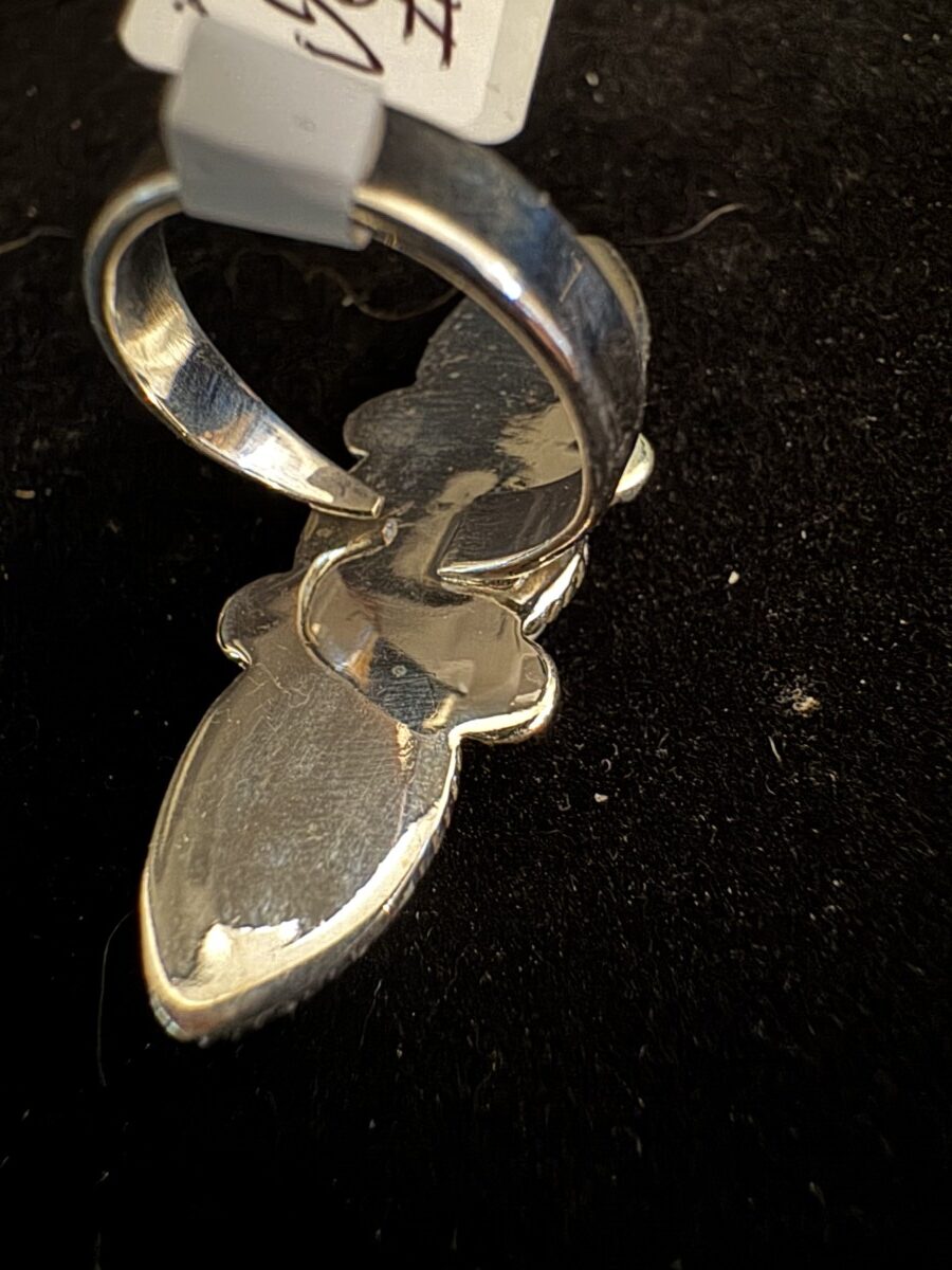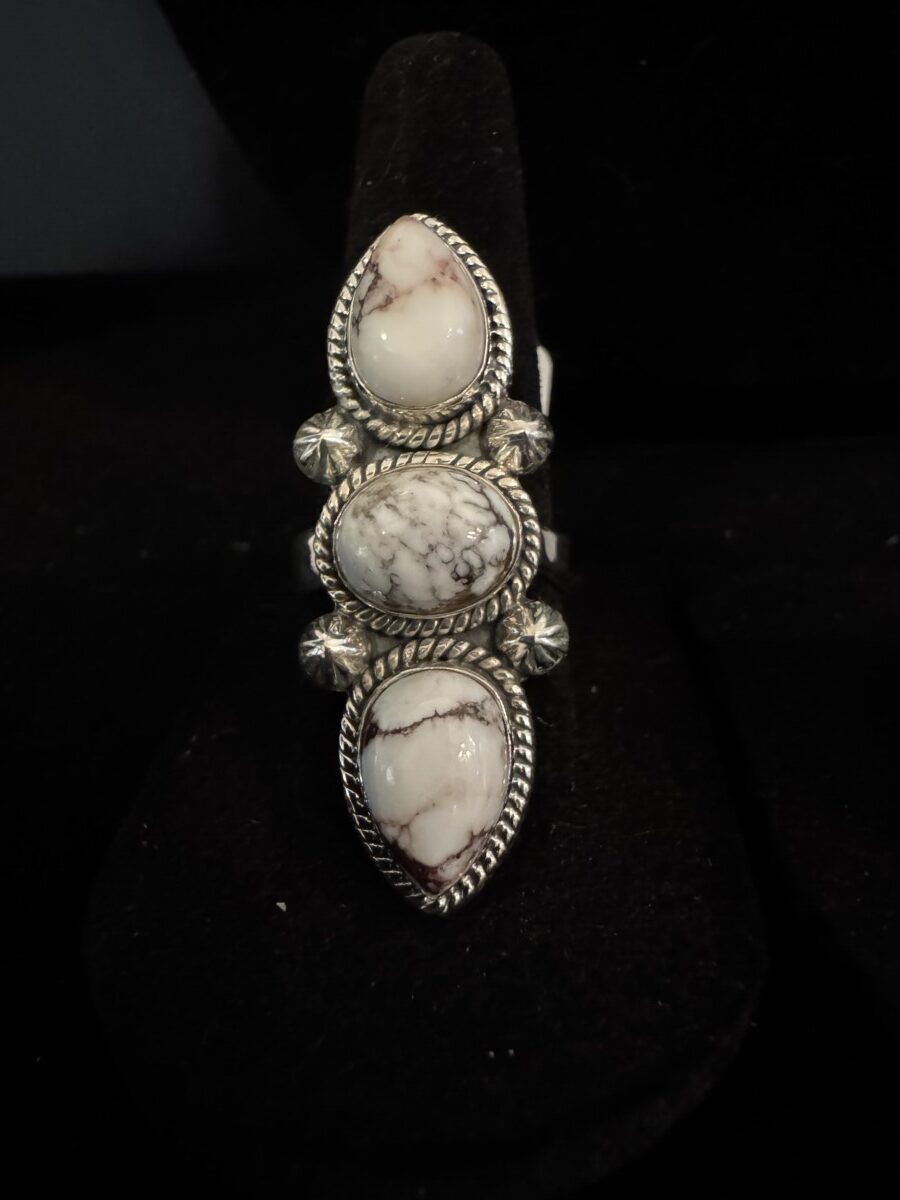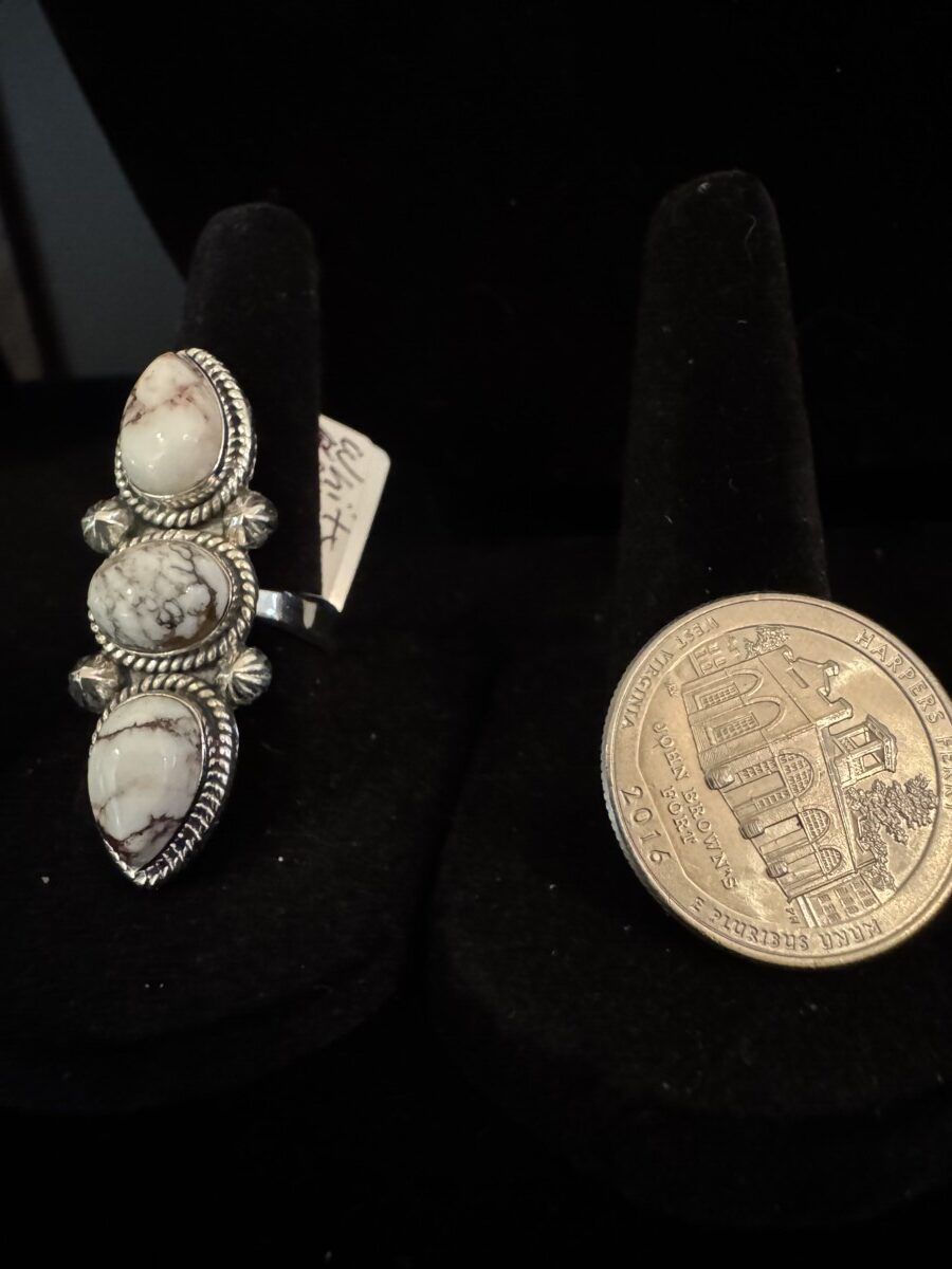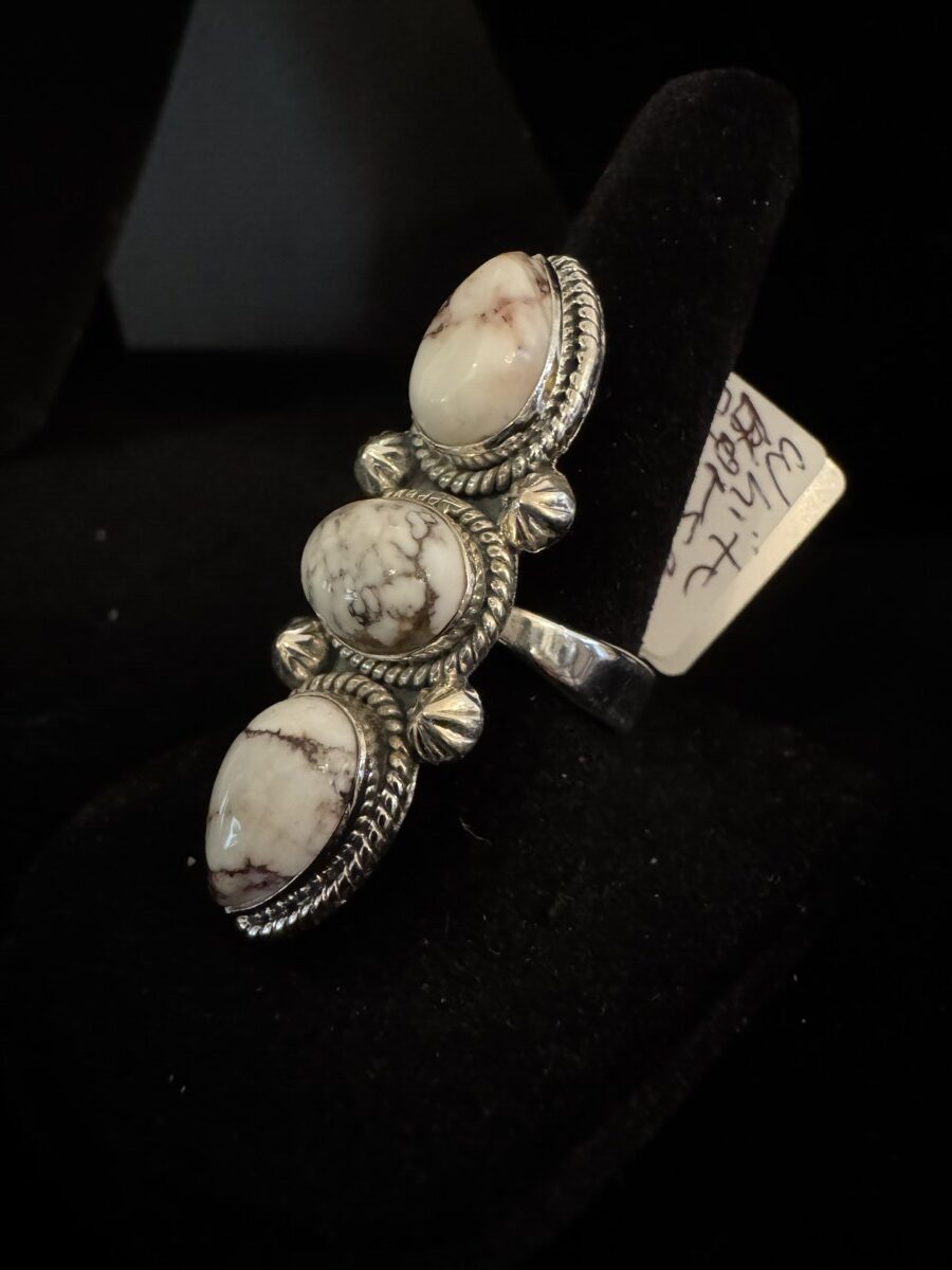 Three beautiful pieces of white horse turquoise sent in an intricate sterling silver setting. Size 7 and could be sized by a jeweler. Closed back