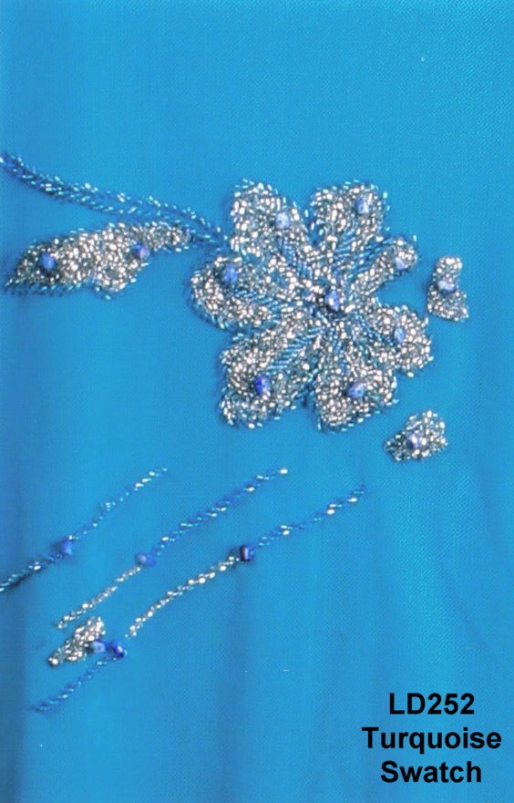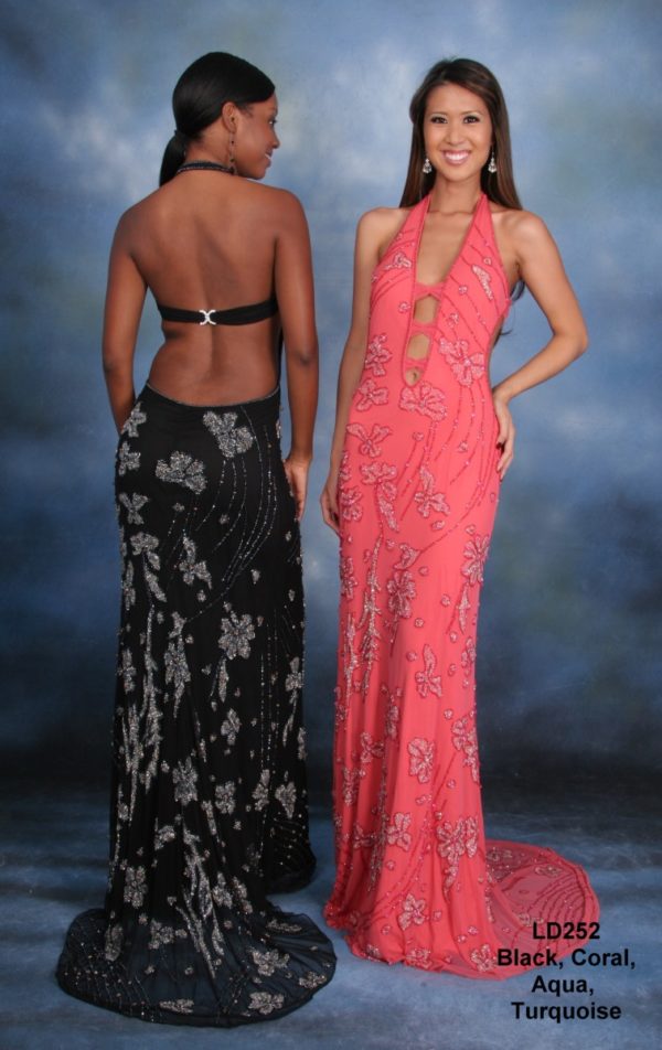 LONG HAND BEADED HALTER DRESS WITH LOW BACK ON POWER MESH FABRIC