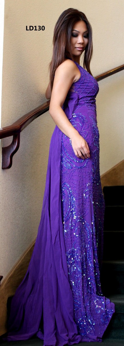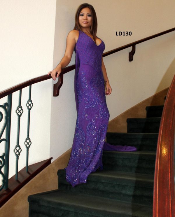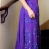 LONG HAND BEADED DRESS ON POWER MESH FABRIC WITH SCARF TRAINS