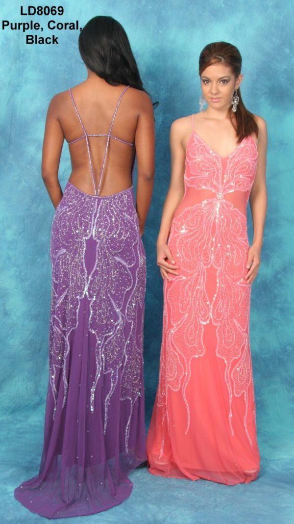 LONG HAND BEADED DRESS WITH SHEER SIDES AND LOW BACK ON POWER MESH FABRIC